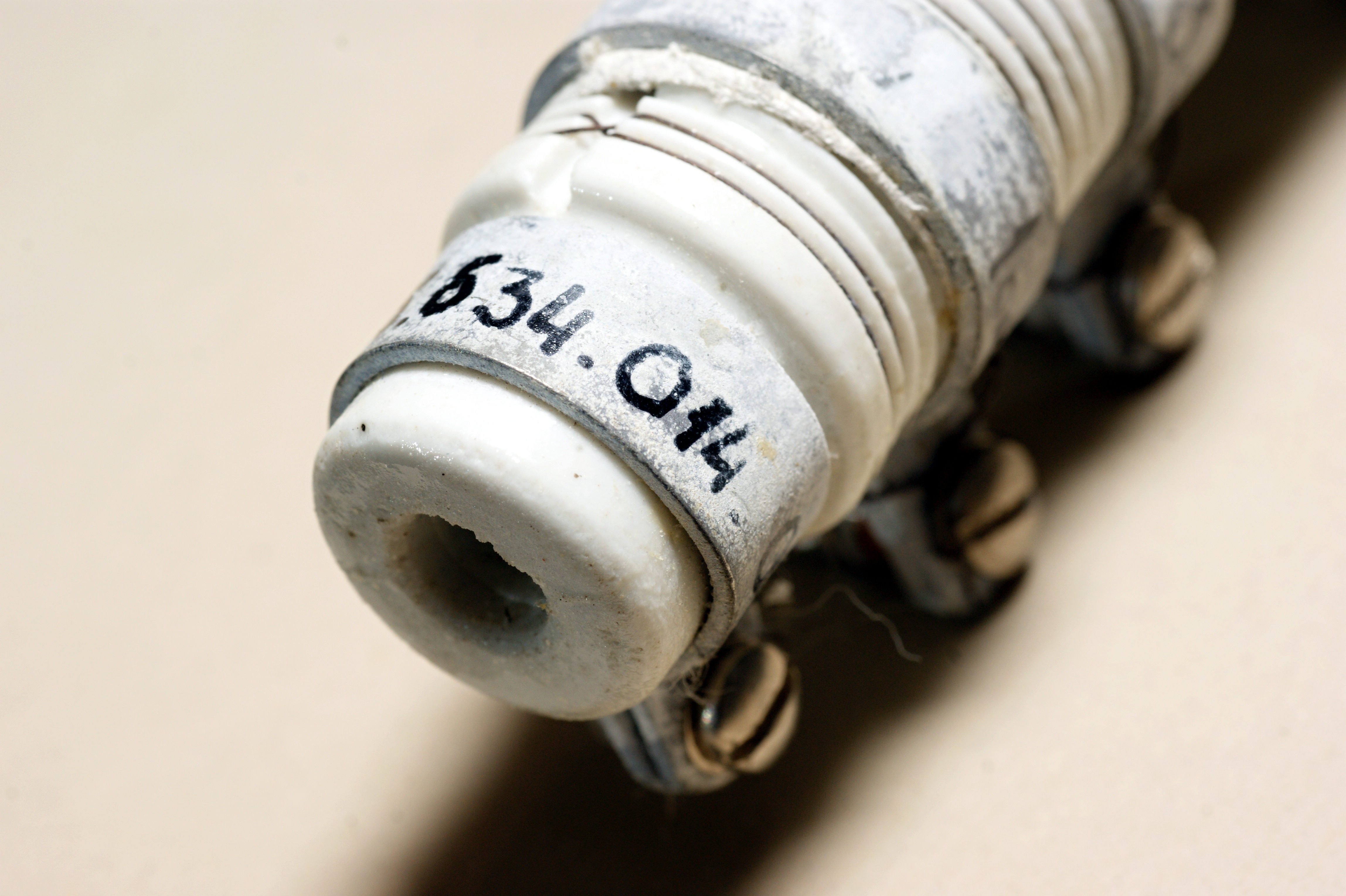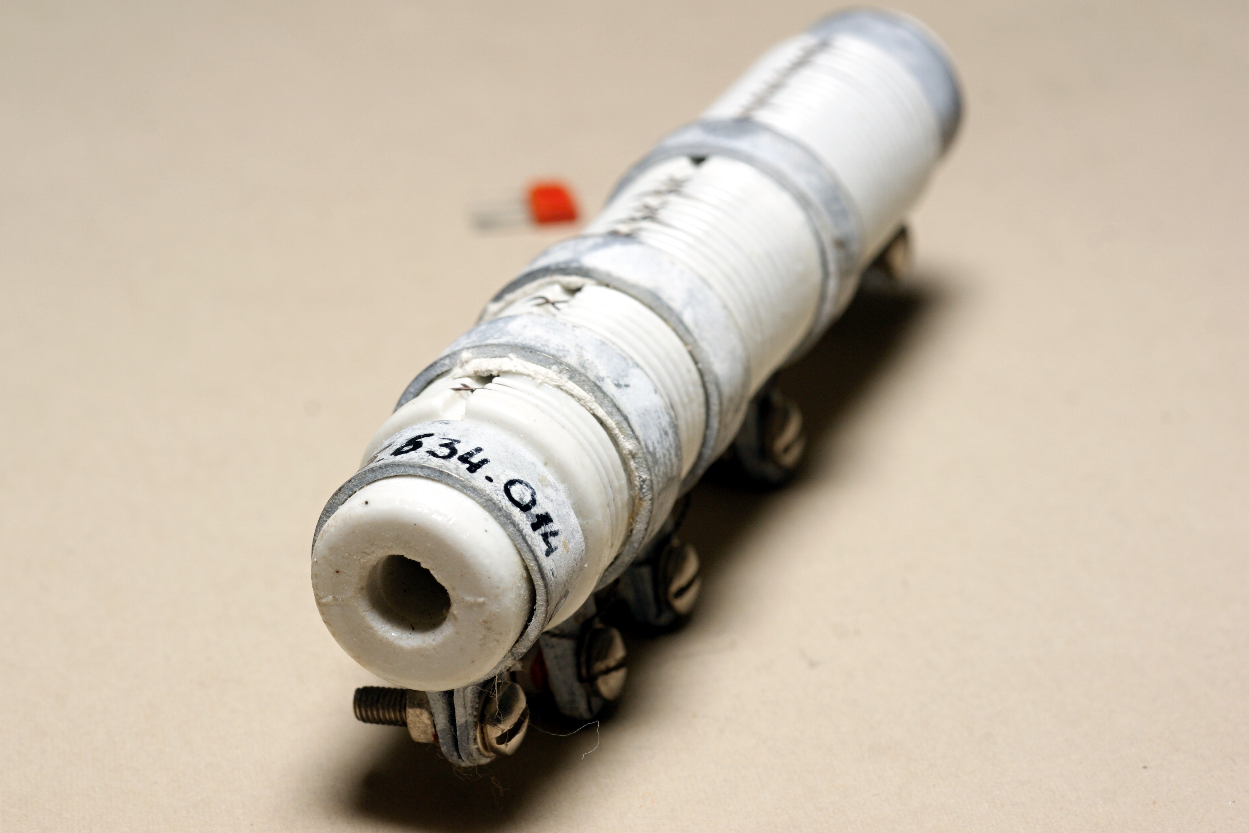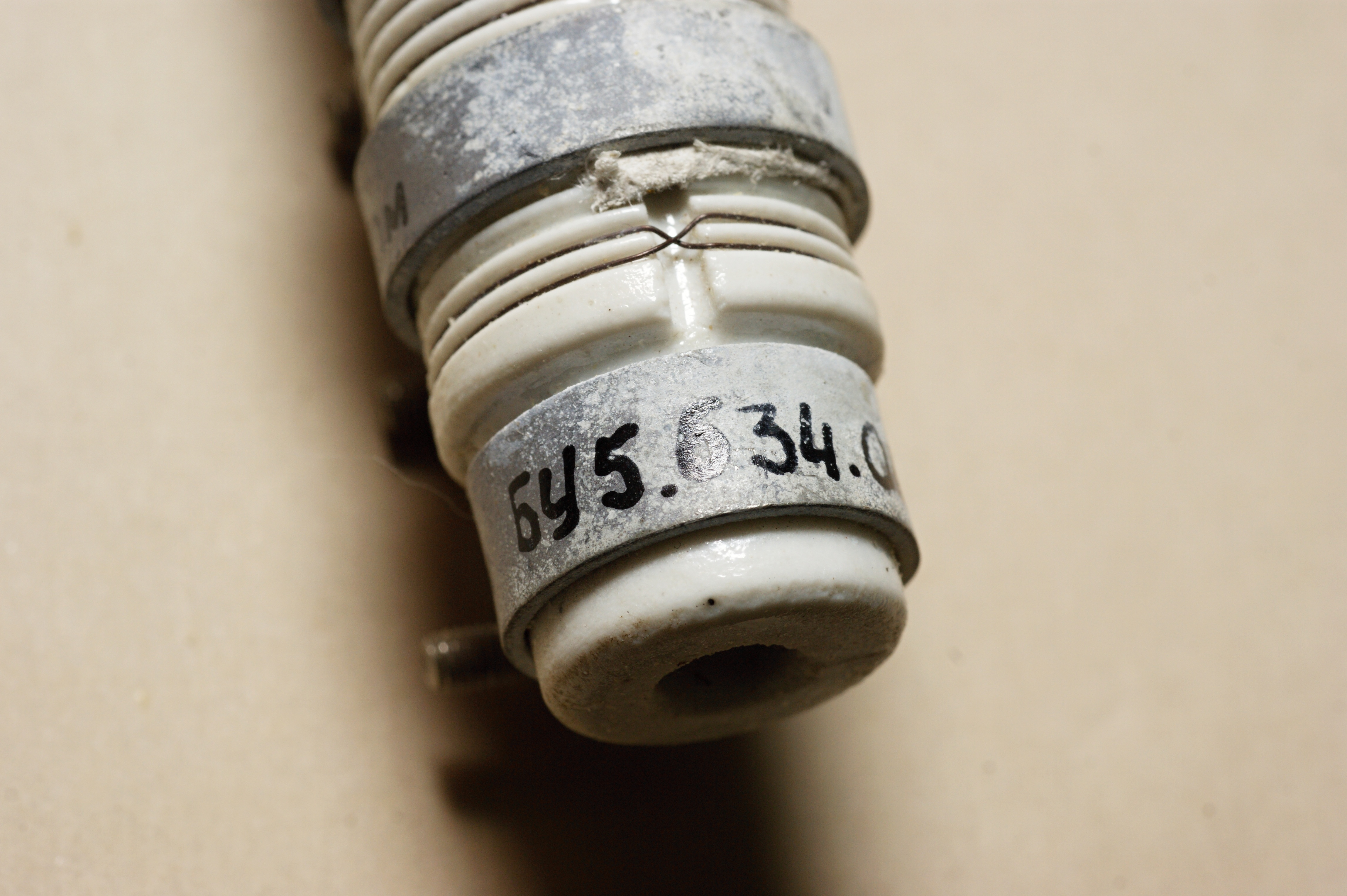 Интересный заказной постоянный резистор необычной конструкции. Низкоомный, мощный, мотан нихромовой проволокой на фарфоровой основе, имеет три отвода. Производитель - Днепровский машиностроительный завод (г.Днепропетровск, Украина).