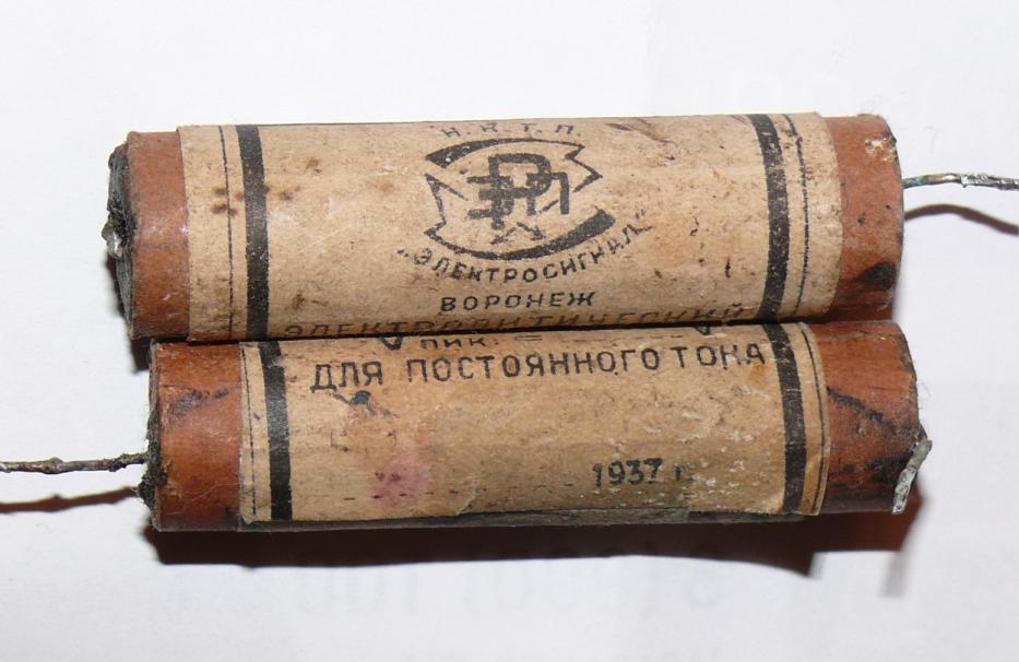 Как писали в журнале "Радиофронт" в 1937 году, "электролитические конденсаторы выпускаются у нас в настоящее время двумя организациями - воронежским заводом "Электросигнал" и Физическим институтом Ростовского университета". Вот собрат ростовского, электролит завода "Электросигнал".