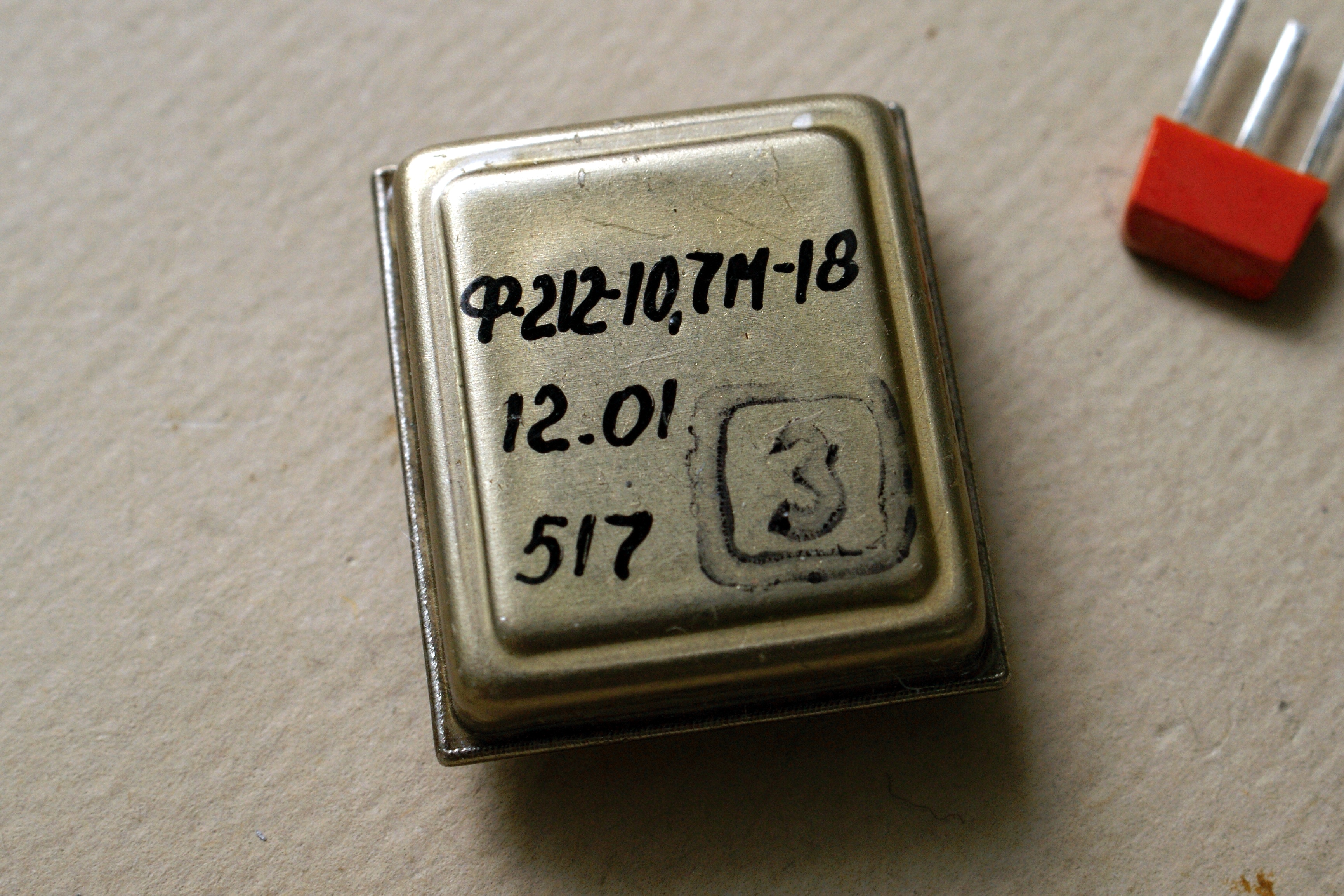 Опять-таки, никаких данных об этой микросборке нет. Но, судя по маркировке, это некий фильтр на 10,7 МГц, от связной аппаратуры, и он похож на изделия новосибирского завода "Электросигнал".