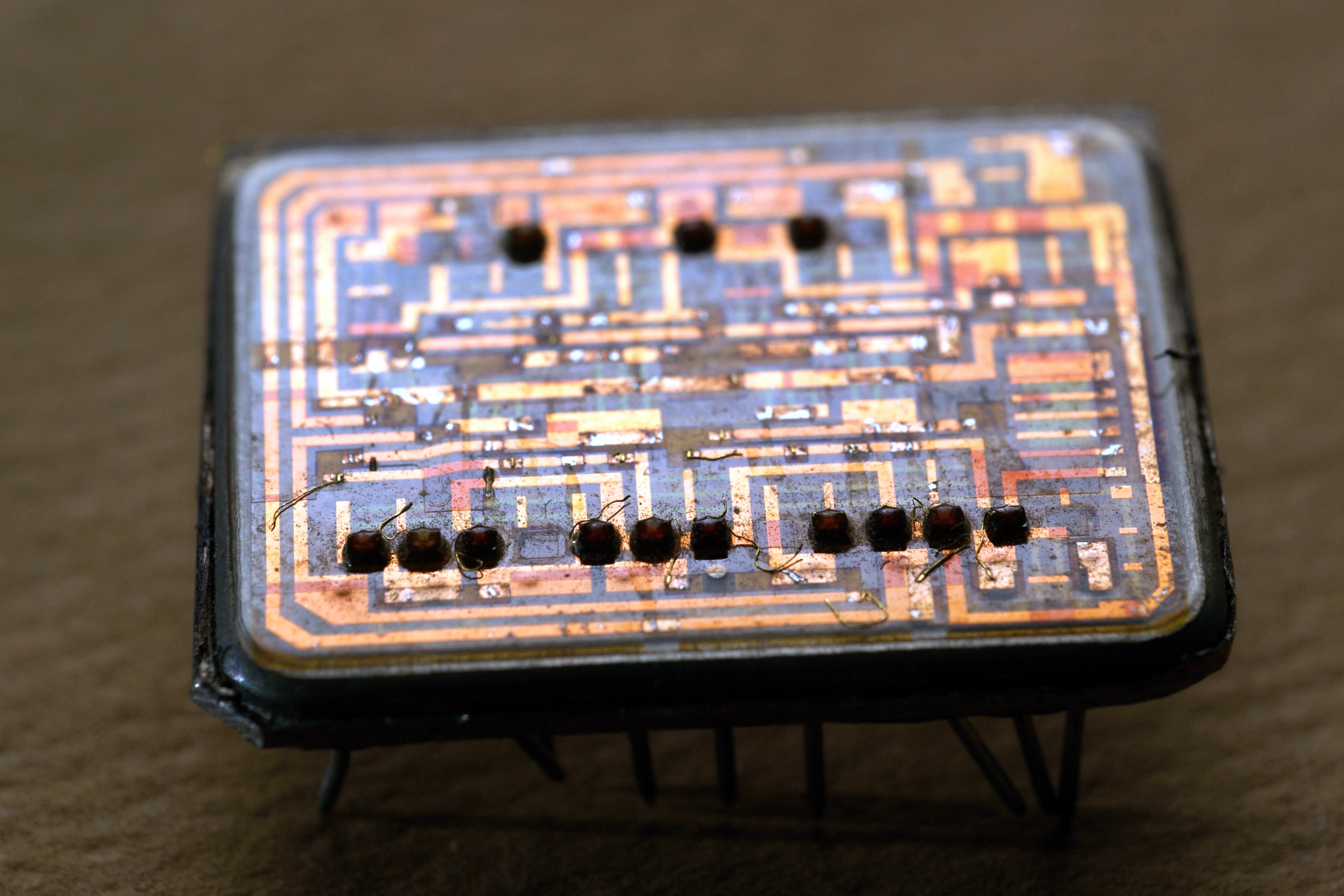 ЭСЛ-логика на дискретных транзисторах + тонкопленочных резисторах. Питание - минус 4 В, время задержки распространения 15 нс. Корпус оригинального типа, под шифром "Вага 1Б".