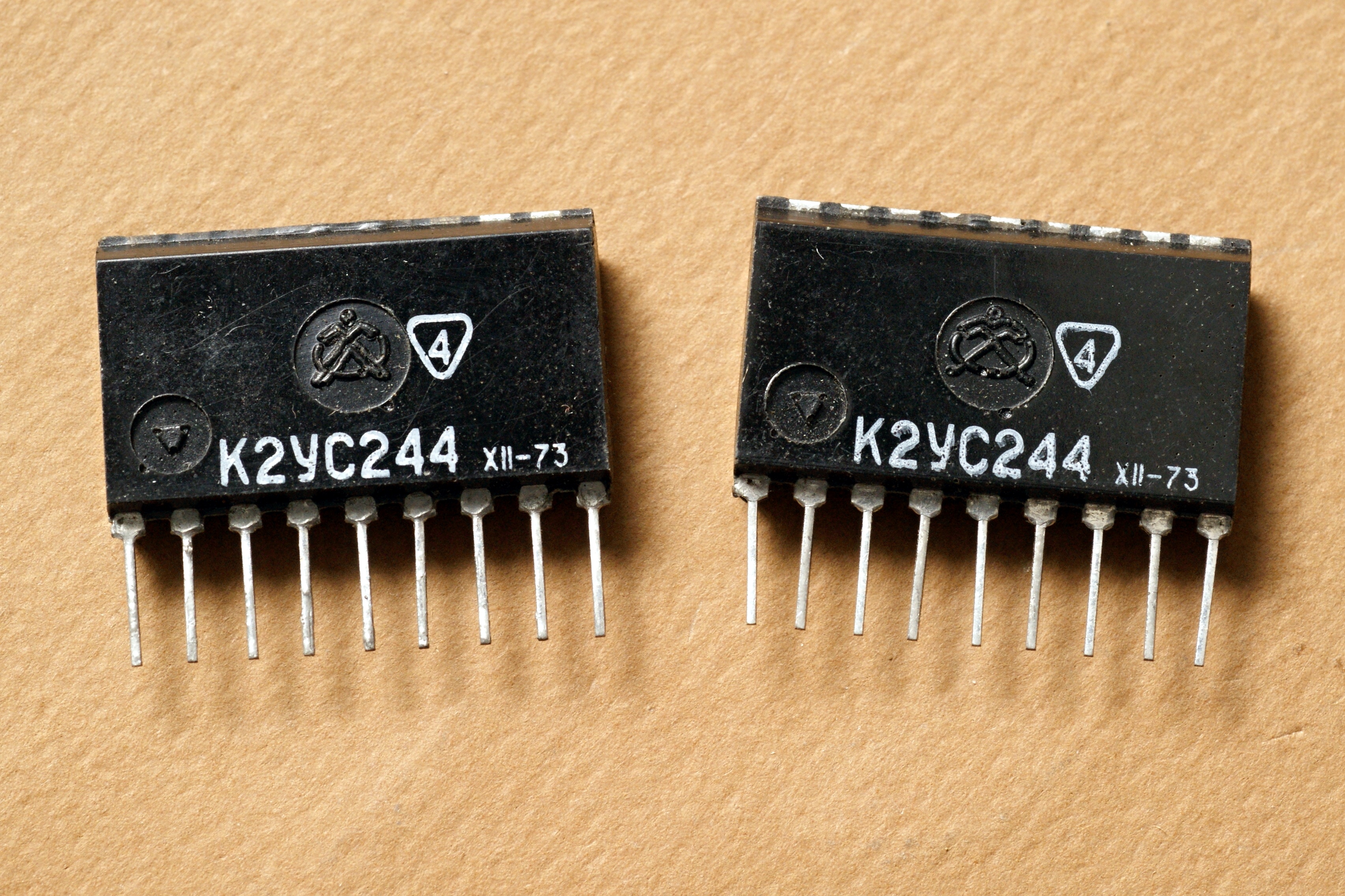 Первое время на микросхемах с двумя конденсаторами ставили точку (для того чтоб отличить от старых?); в дальнейшем от этого отказались. В таком виде они и дожили до конца СССР...