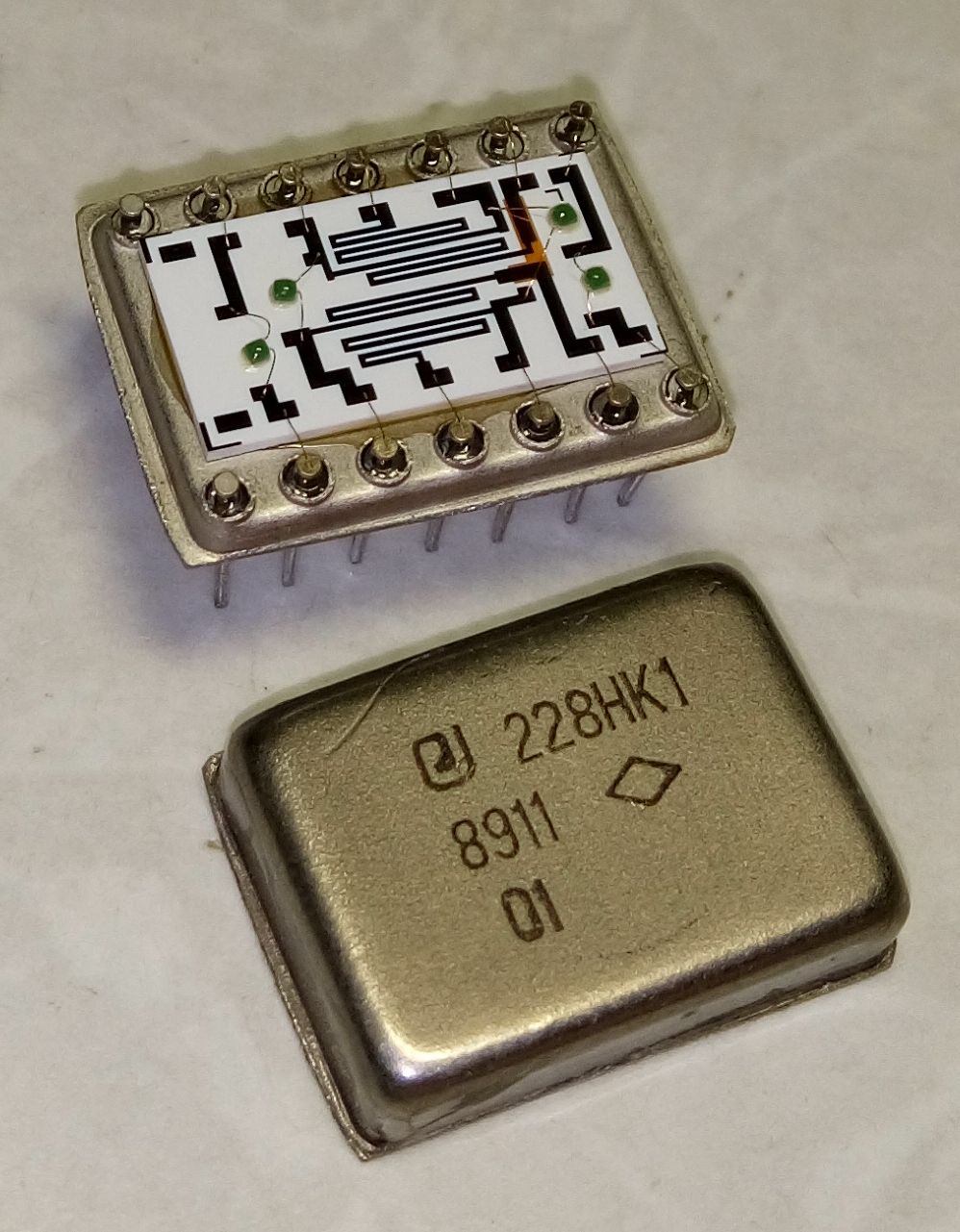 Справочный лист на нее. В качестве активных элементов в этой микросборке применяются бескорпусные транзисторы 2Т307. Интересно, что в большинстве отечественных справочников внутренняя схема изображалась с ошибкой - у одного из транзисторов дифф. пары коллектор был перепутан с эмиттером... Старые выпуски назывались 15МЛ13. |