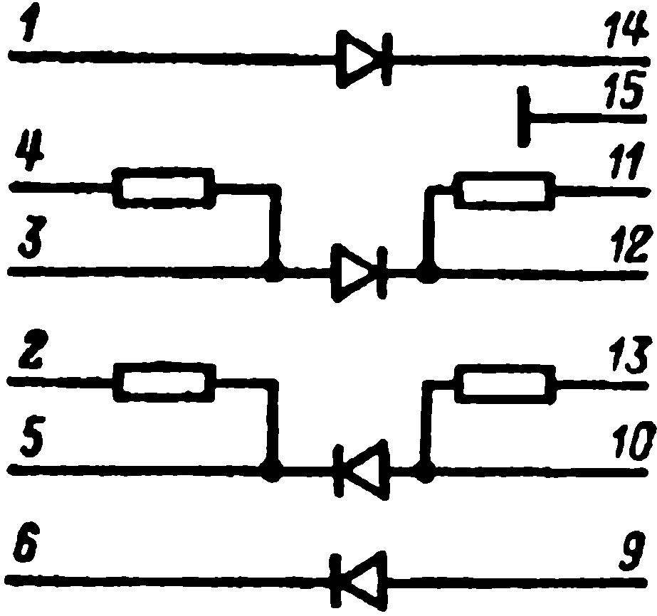 Микросхема состоит из двух транзисторов КТ307, включенных по схеме ОЭ—ОБ,