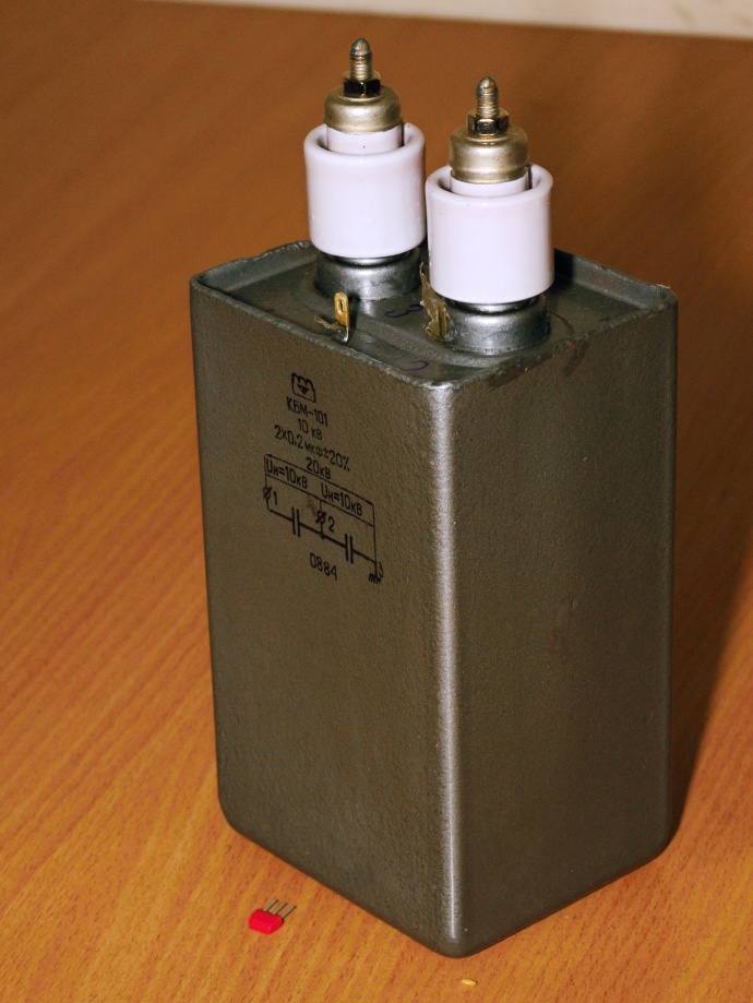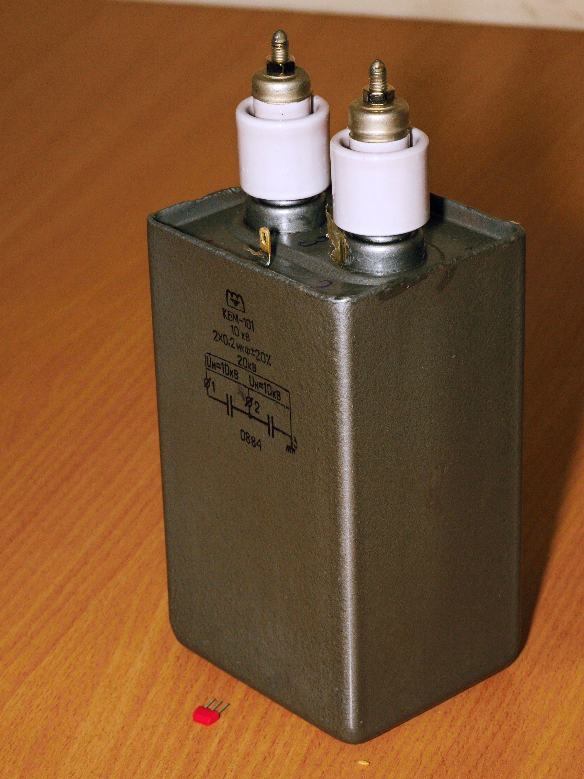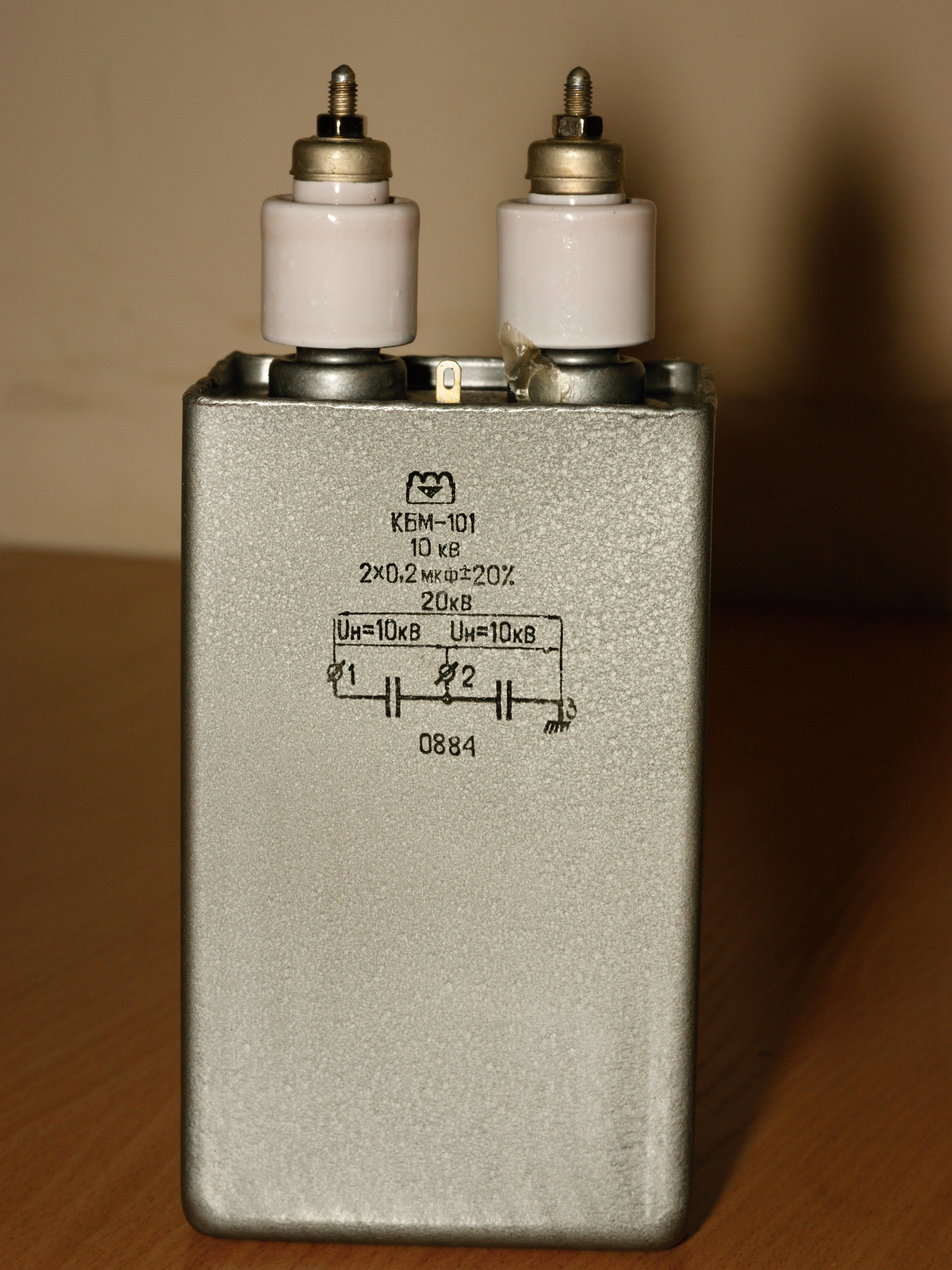 Это высоковольтная (10 кВ) сборка из двух секций по 0,2 мкФ, со средней точкой. Что интересно, обычно подобные конденсаторы импульсные, но для КБМ-101 основной режим работы - на постоянном токе, в схемах выпрямителей с удвоением напряжения.