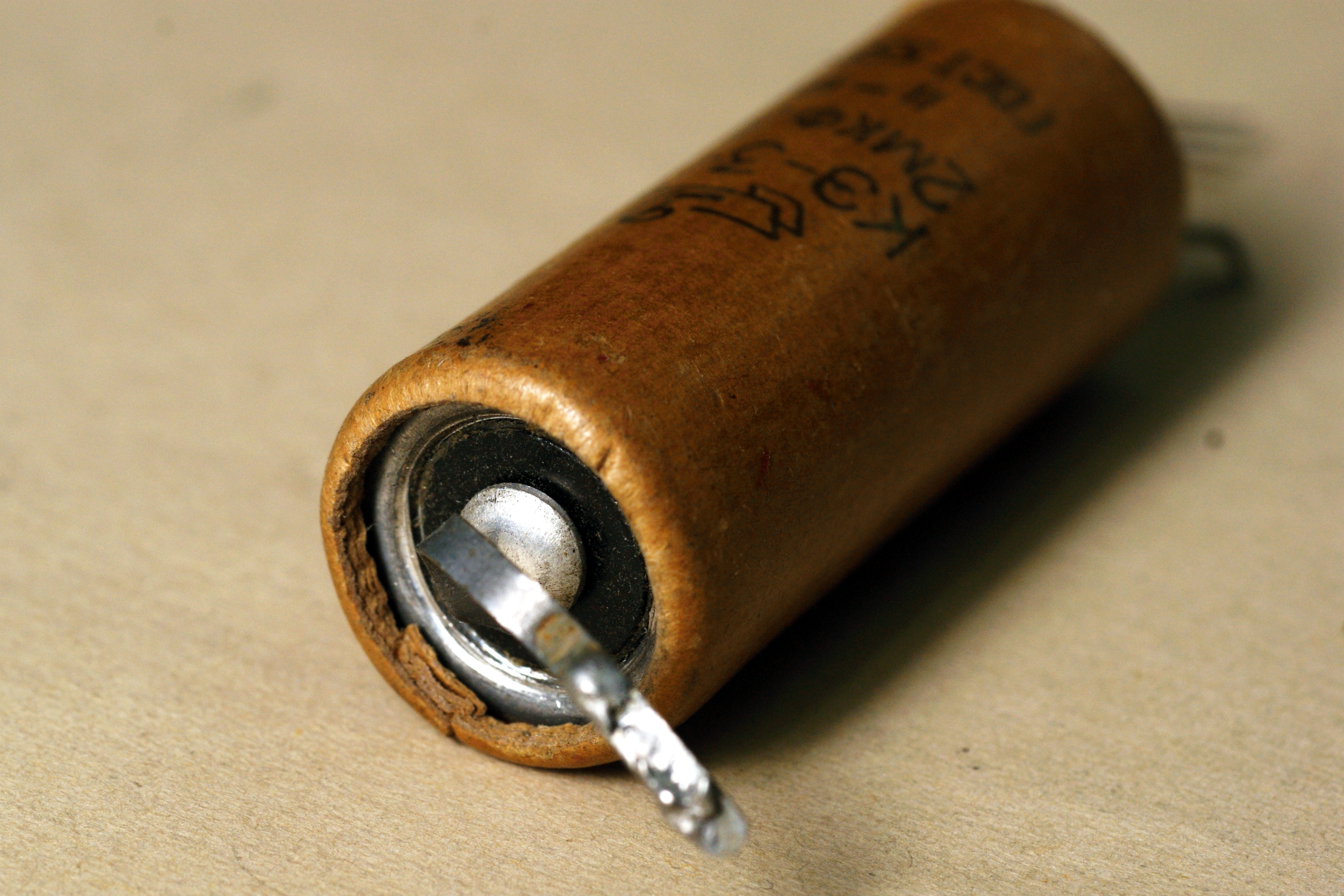Третий вариант старых электролитических конденсаторов КЭ, по ГОСТ 5561-54 (до 1954 года - по ВТУ №623-48). "Тройка" - аксиальное исполнение, с гибкими выводами.