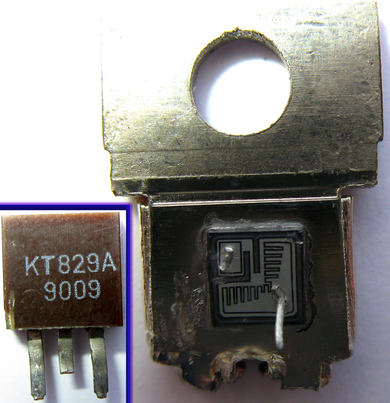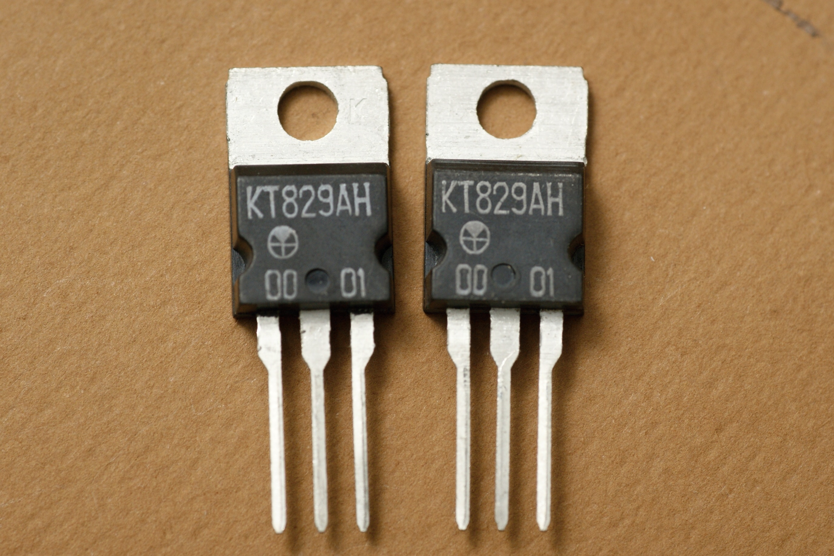 Версия АТ - редка, она из новых. Этот транзистор представляет собой улучшенный вариант КТ829А - расширен температурный диапазон до военных рамок -60...+125°С, почти вдвое снижено падение напряжения в открытом состоянии, слегка увеличено допустимое напряжение коллектор-эмиттер. Они разработаны для применения в автомобильных регуляторах напряжения.
