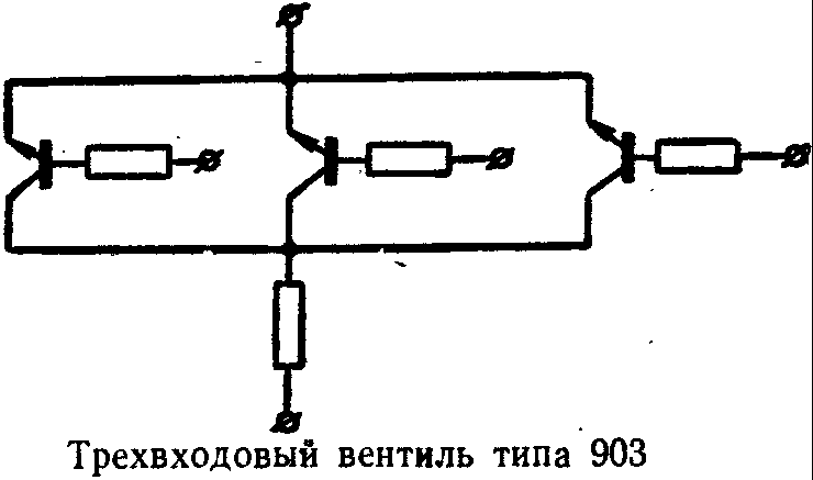Трехвходовый вентиль типа 903 выполняет логические операции НЕ—И/НЕ—ИЛИ. Время распространения сигнала 12 нсек, рассеиваемая мощность 12