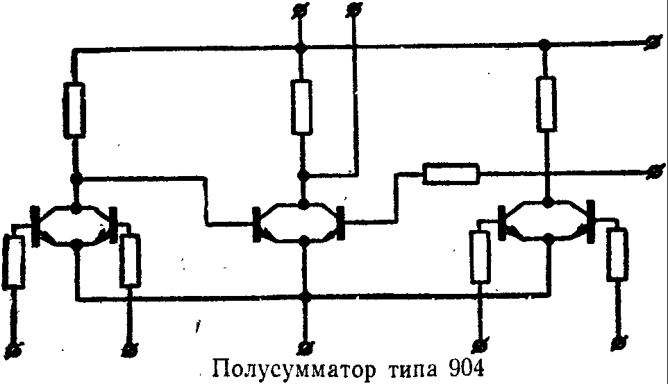 Полусумматор типа 904, представляющий собой двухуровневую схему И/ИЛИ, может служить в качестве готовой ячейки полусумматора, а также вентиля, выполняющего логические функции типа «исключающее ИЛИ» и ряд других. Время распространения импульса 18 нсек, рассеиваемая мощность 34