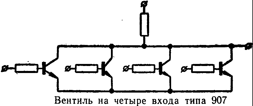 Вентиль типа 907 на четыре входа представляет собой схему НЕ—И/НЕ—ИЛИ с четырьмя входами. Время распространения сигнала 12 нсек, рассеиваемая мощность 12