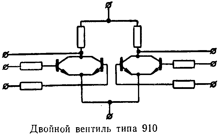 Двойной вентиль типа 910 может быть использован как два логических вентиля НЕ — ИЛИ, триггер с раздельными входами установки и сброса, сдвоенный инвертор или как два раздельных инвертора. Время срабатывания 45 нсек, рассеиваемая мощность 4