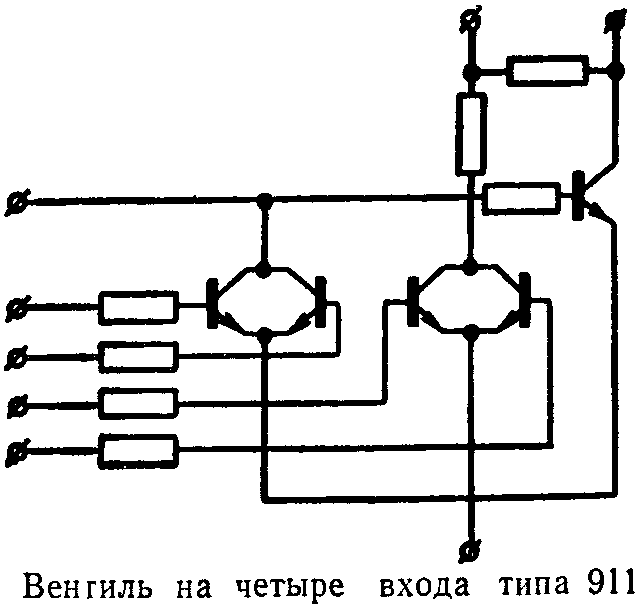 Вентиль типа 911 на четыре входа может служить в качестве схемы ИЛИ. Время срабатывания 80 нсек, рассеиваемая мощность 4