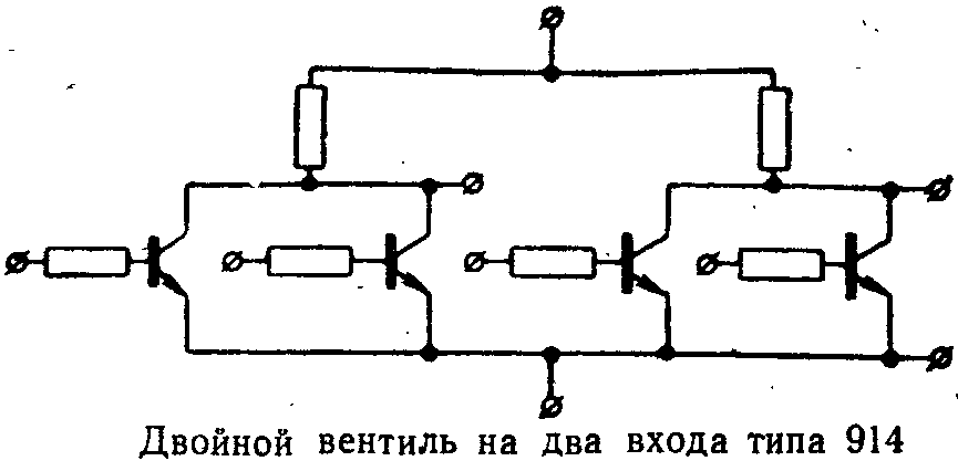 Двойной вентиль типа 915 на три входа представляет собой комбинацию из двух трехвходовых схем НЕ—И/НЕ—ИЛИ.