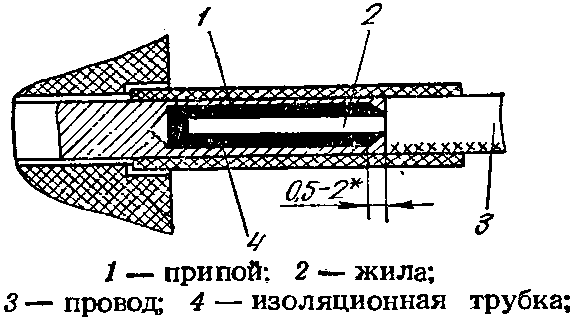 Зачистку проводов от изоляции производят на глубину отверстия с припуском, а жилы скручивают и облуживают, лишнюю длину зачищенных жил удаляют. Длина жилы, входящей в отверстие