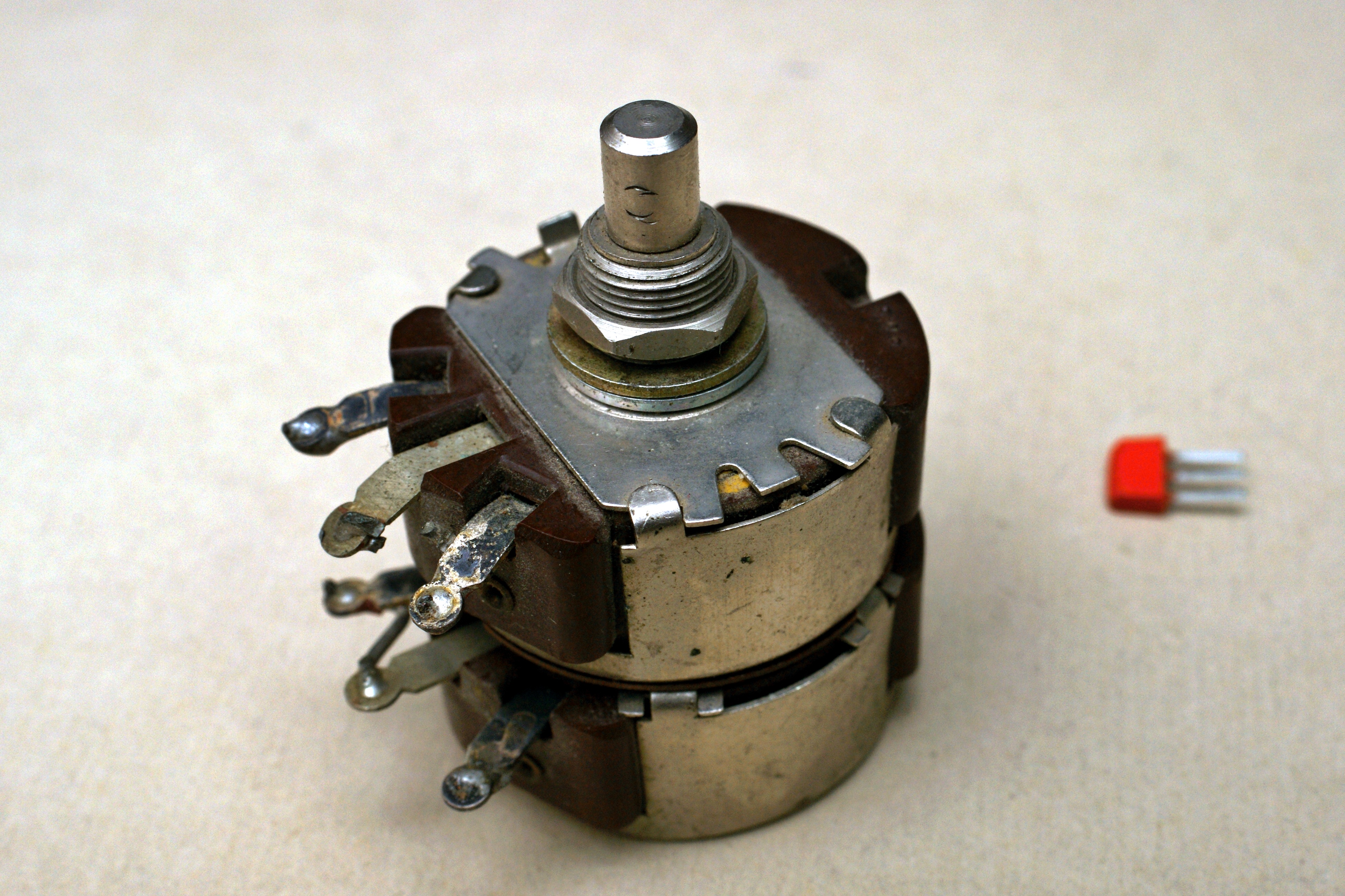 Сдвоенный переменный резистор на 200 Ом. Подобные у меня уже есть, к примеру РП-3, но всё же конструкция у него отличается. Есть карболитовый прилив со стороны, противоположной выводам, и крепление металлических частей выполнено по-другому. Так что я считаю его отдельным типом.