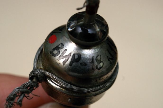 обычную для радиоламп того времени. С одной стороны в оболочку впаивалась