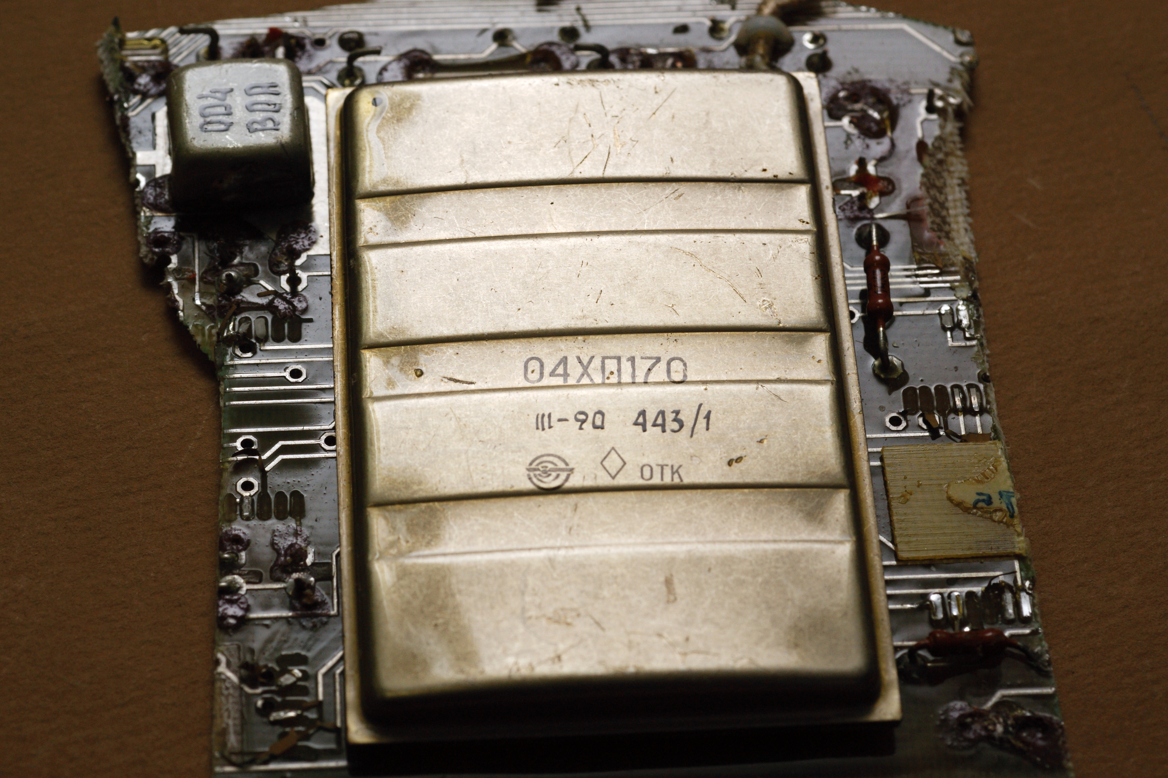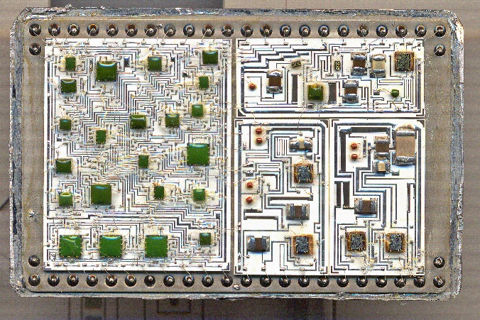Микросборка неизвестного назначения; применялась в составе "изделия А-723" (авиационная радиотехническая система дальней навигации). Производитель - киевский завод "Радиоизмеритель". Она включает в себя как цифровую, так и аналоговую части, причем они явно отделены друг от друга. Общее число кристаллов достигает 27 штук, что делает эту микросборку претендентом на звание самой сложной. Чем отличается версия с единичкой, неизвестно. |