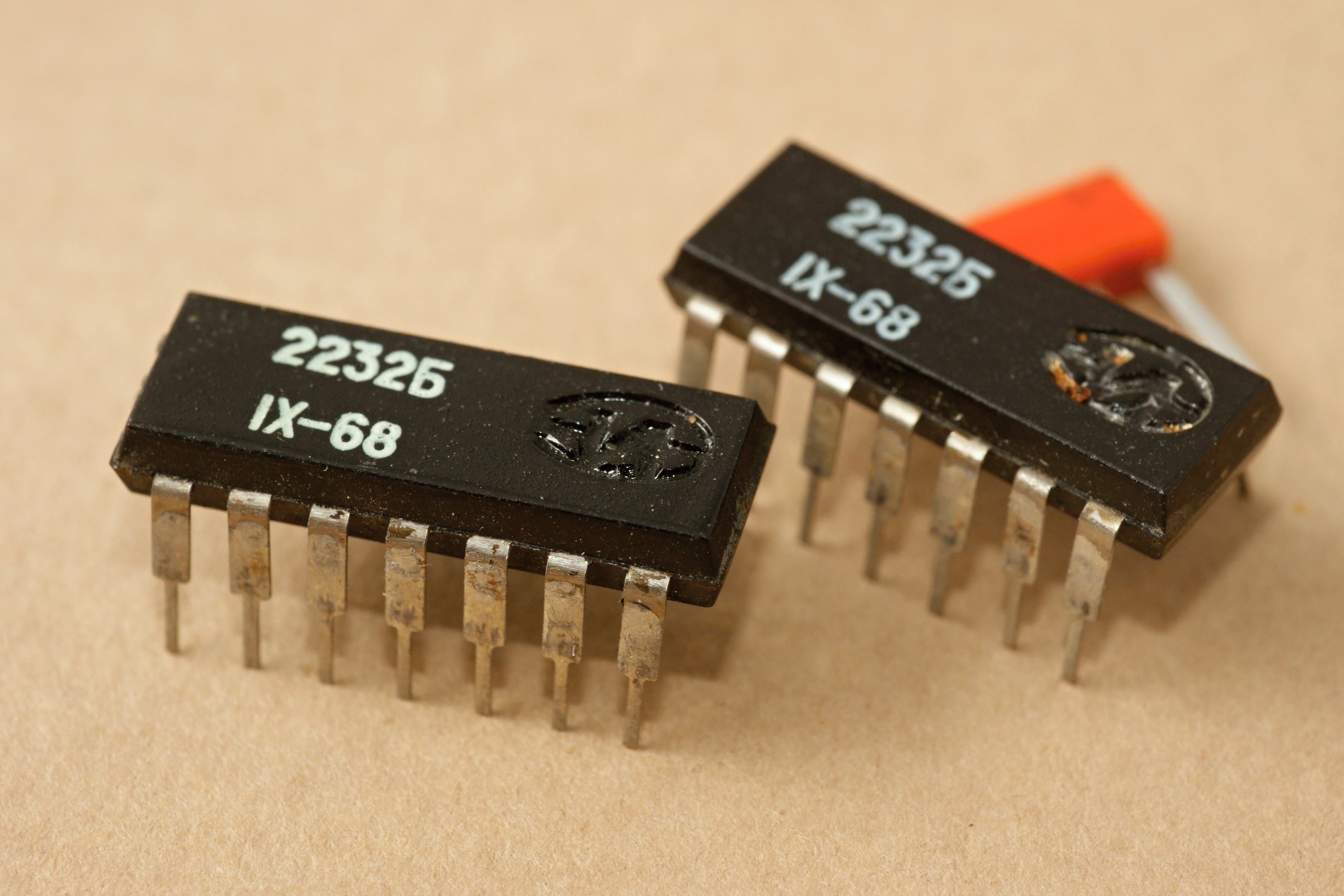 Интересные микросхемы. Судя по таблице условных обозначений, перед нами - первые выпуски 1УС222А/Б. Однако же 122ая серия выпускалась в круглых металлостеклянных корпусах. Такие же микросхемы, но в пластмассе - это должны быть К1УС181А/Б...