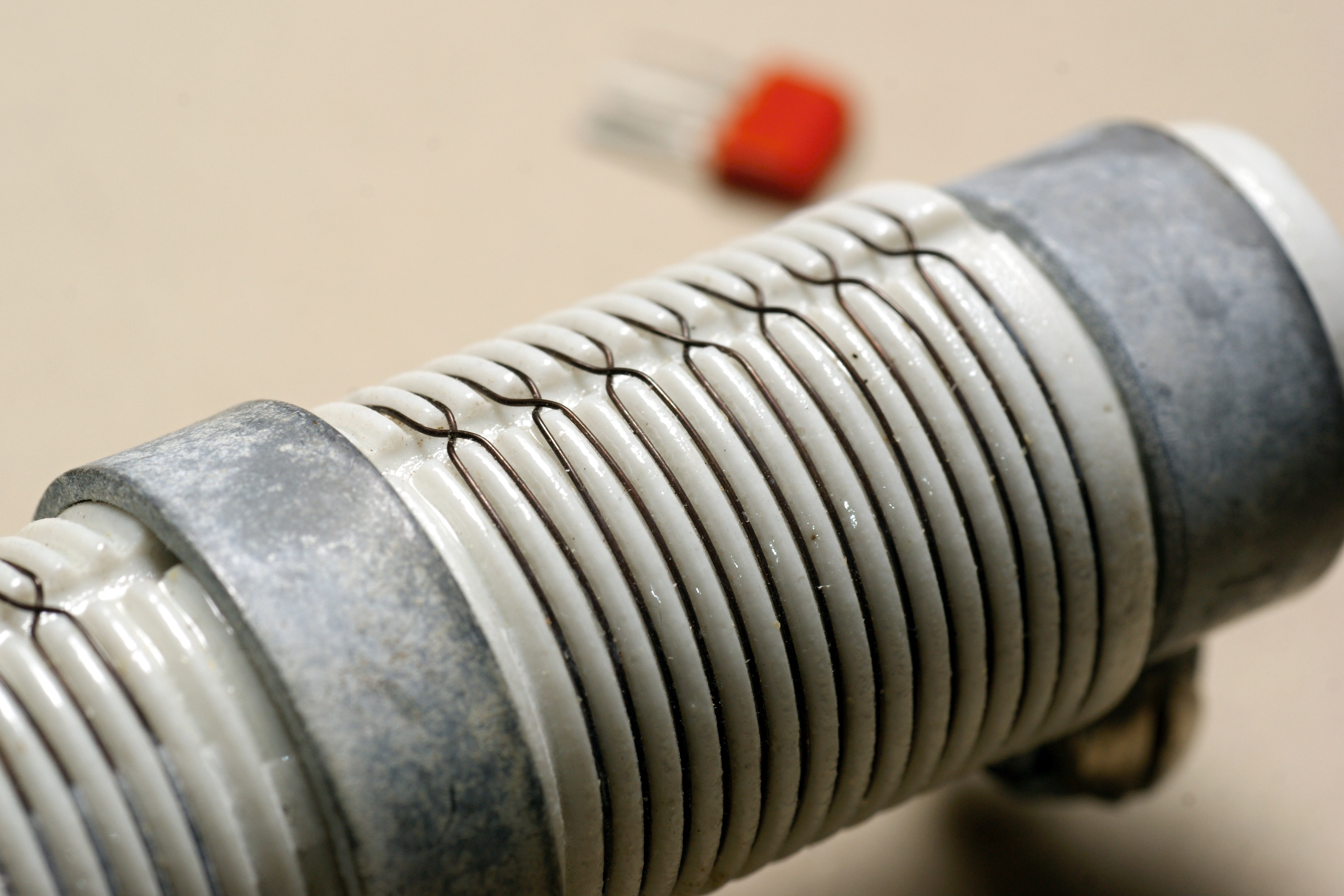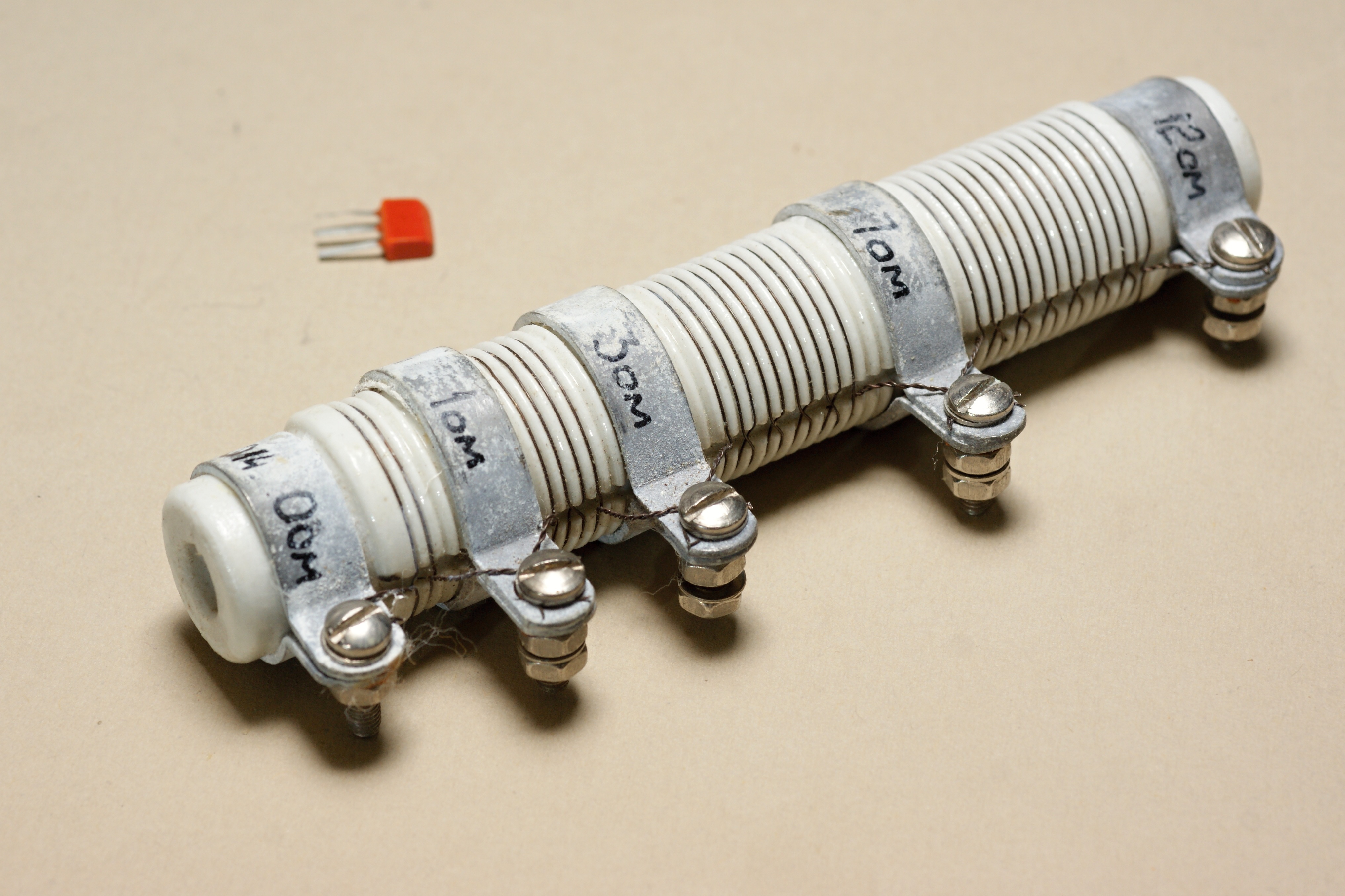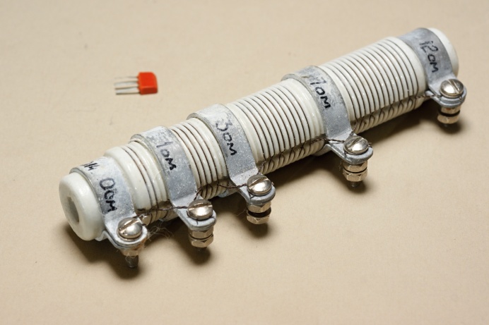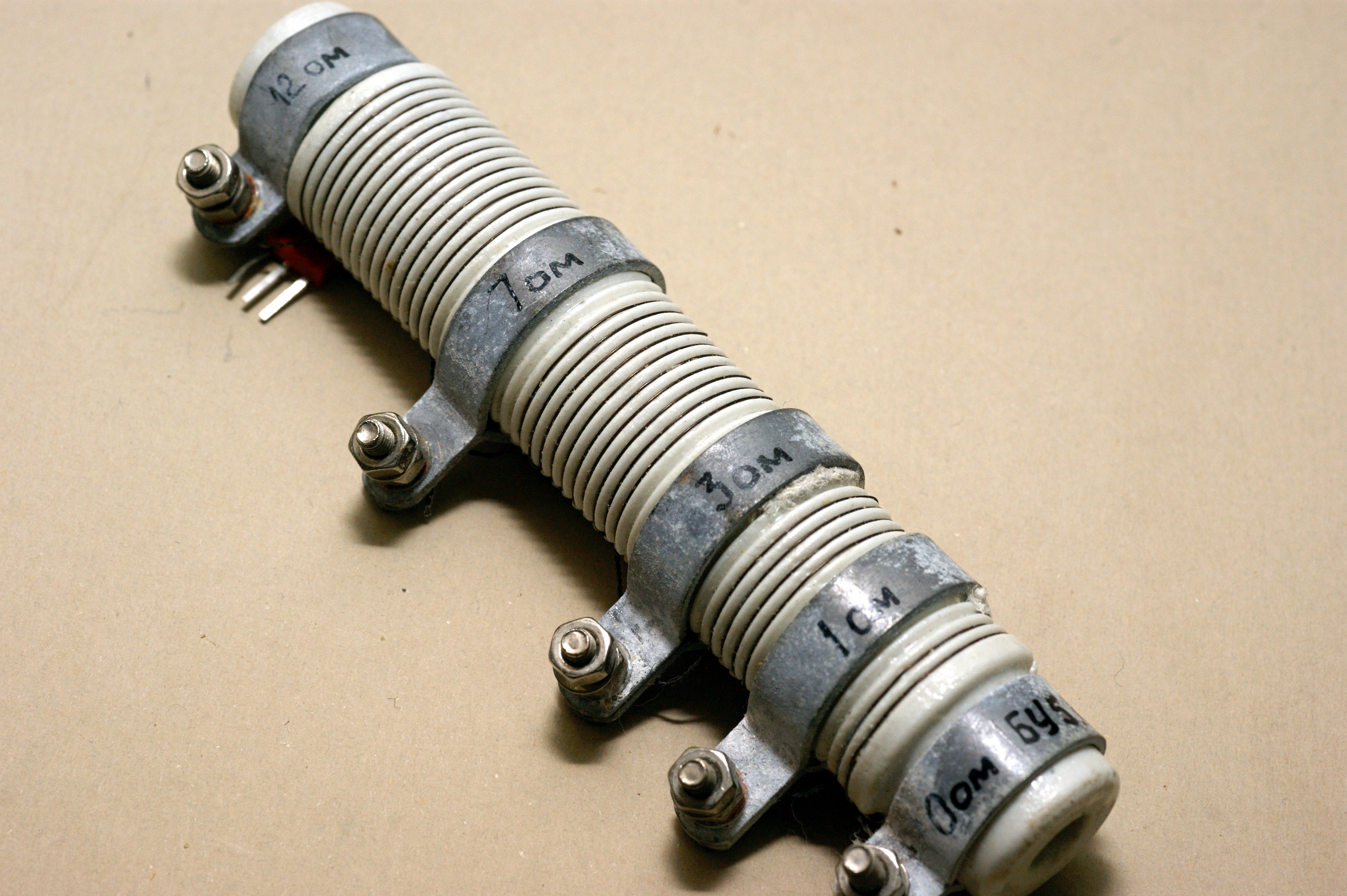 Интересный заказной постоянный резистор необычной конструкции. Низкоомный, мощный, мотан нихромовой проволокой на фарфоровой основе, имеет три отвода. Производитель - Днепровский машиностроительный завод (г.Днепропетровск, Украина).