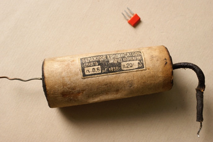 Некий бумажный конденсатор, который я пока отношу к неопознанным. Он похож на БК, но имеет заметные отличия в конструкции. Так, явно видимого корпуса у него нет, и заливка торцов у него не парафиновая, а битумная.