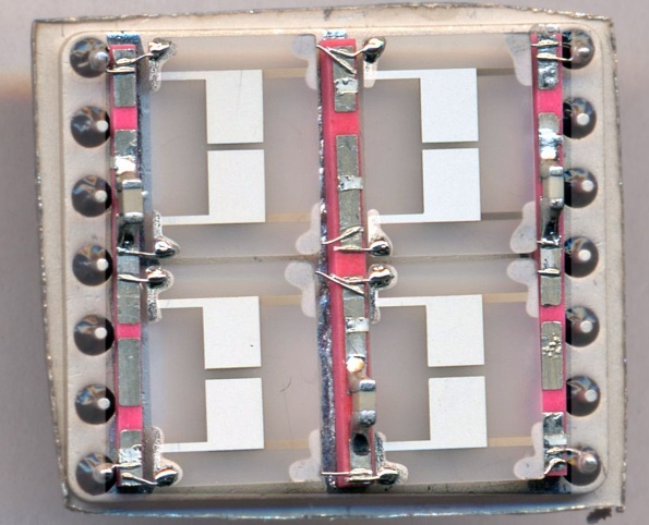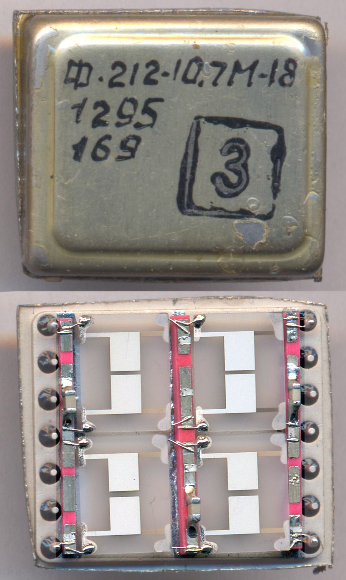 Опять-таки, никаких данных об этой микросборке нет. Но, судя по маркировке, это некий фильтр на 10,7 МГц, от связной аппаратуры, и он похож на изделия новосибирского завода "Электросигнал".