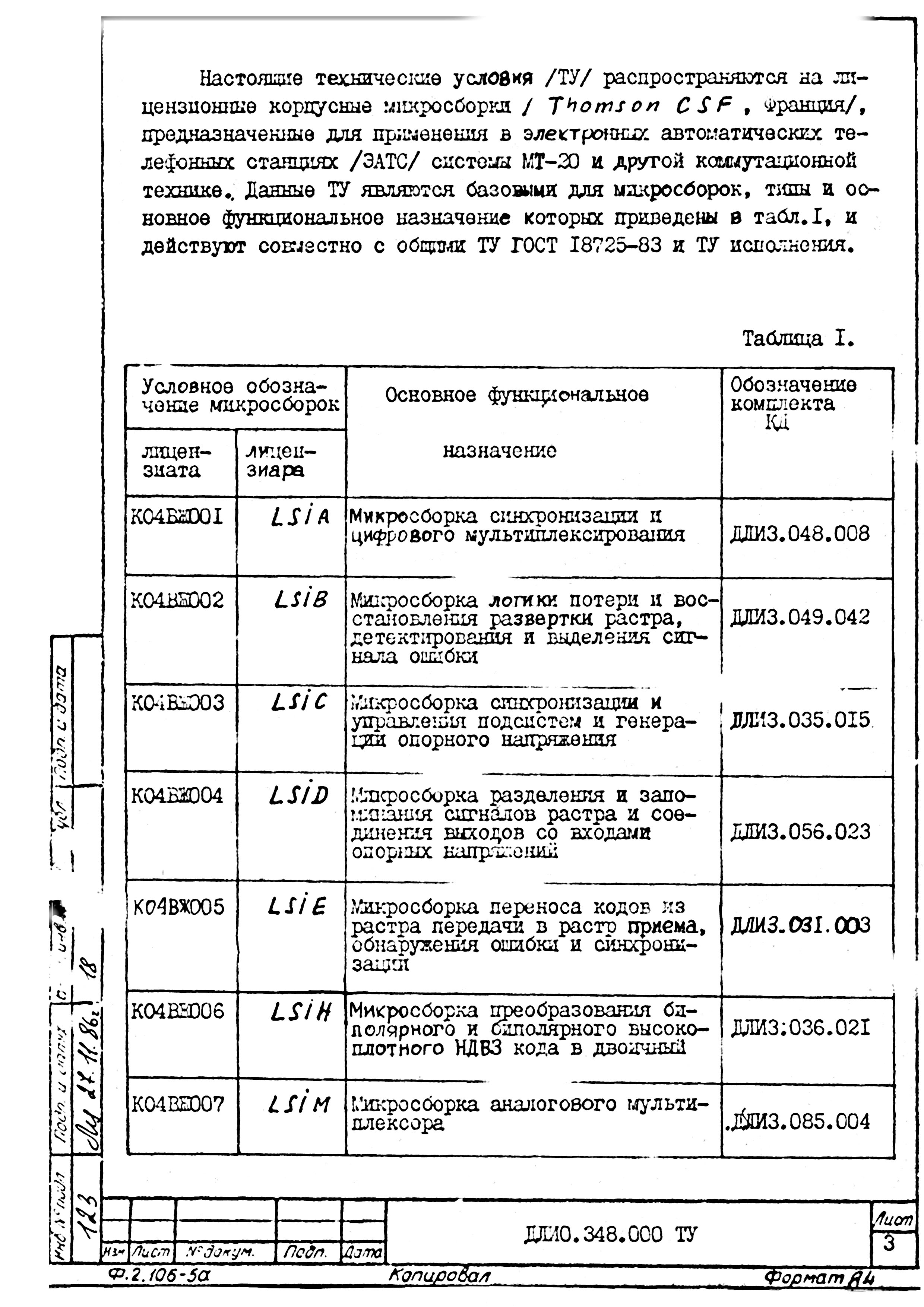 Назначение - преобразователь биполярного и биполярного высокоплотного кода (HDB3) в двоичный (AMI) в трактах аппаратуры ИКМ-30; аналог микросборки LSIH, она же EFB7446, от Thomson-CSF.