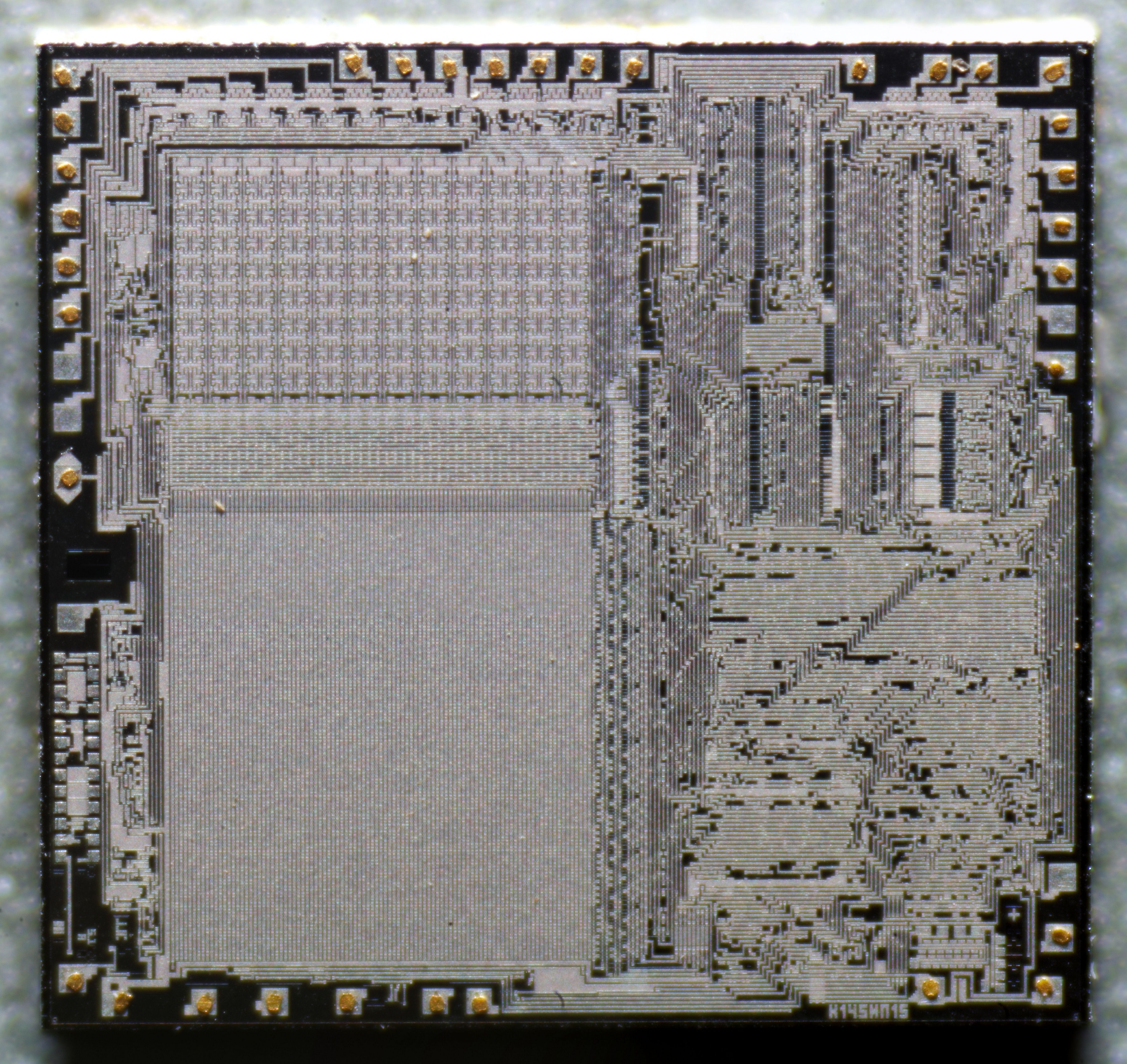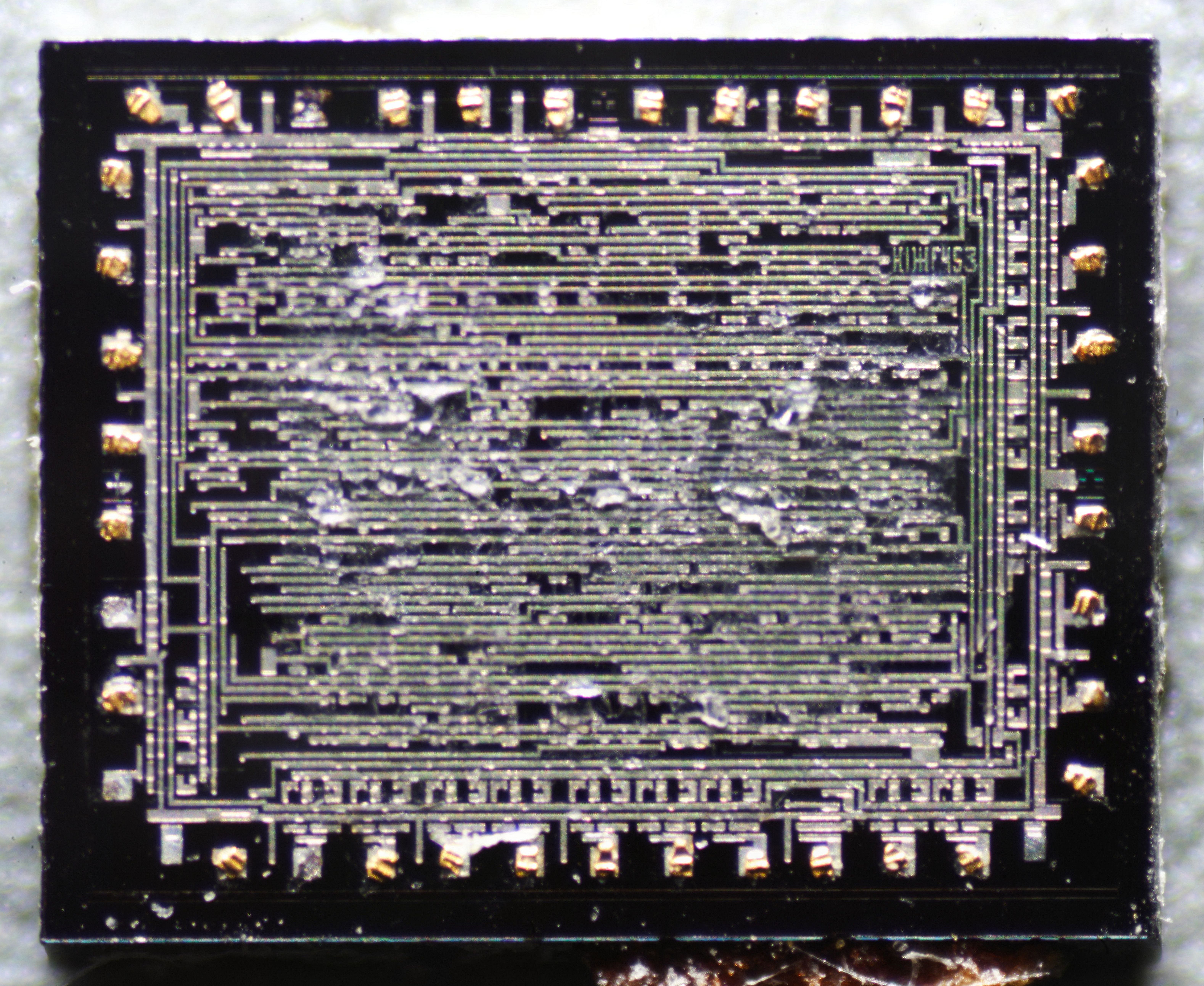 Применялась в калькуляторе МК-41. Подробностей нет. Микросхема разработана в ЛКТБ по ОКР "Гранат", главный конструктор Росляков, схемотехник Берлинков, тополог Рыжкова. Производитель - "Светлана", Санкт-Петербург. |