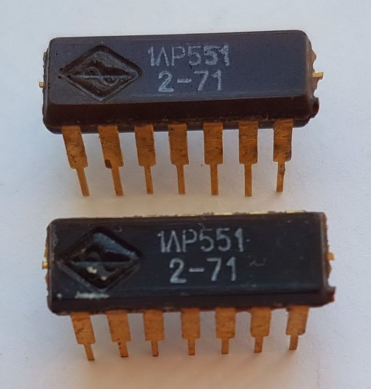 Интересный экземпляр - во-первых, почти единственный свидетель выпуска этой серии на Воронежском заводе полупроводниковых приборов, во-вторых редкий вариант корпуса DIP, с золочеными ногами: