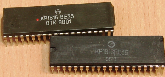 Но всё же пара необычных экземпляров у меня есть... это процессоры со странным обозначением, КР1816ВЕ35А-ЭО/ОЭ. Если буква "А" еще как-то объяснима - это версия с пониженной тактовой частотой, то "ЭО"... гм...