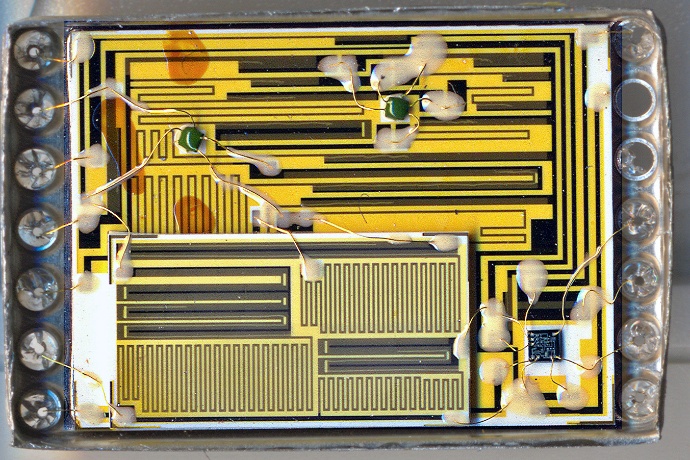 Микросборка состоит из пассивной тонкопленочной микросхемы с напыляемыми резисторами и навесных активных элементов - бескорпусного ОУ 740УД1А и бескорпусных диодных матриц КД907Г.