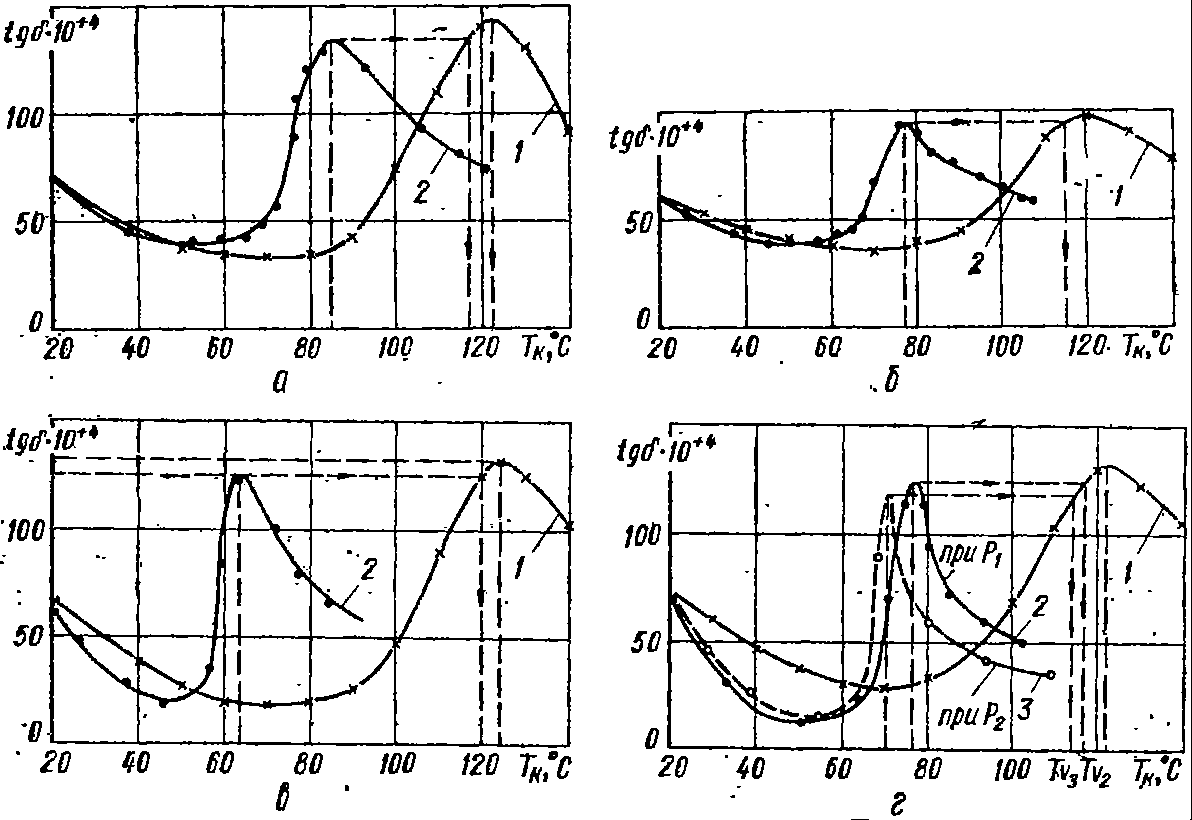 1 - градуировочная зависимость, 2 - рабочая зависимость; а - К73-16-63 В-6,8 мкФ; б - К73-16-63 В-6,8 мкФ; в - К73-16-63 В-0,47 мкФ; г - К73-16-63 В-1,0 мкФ (2 - при P1, 3 - при Р2)