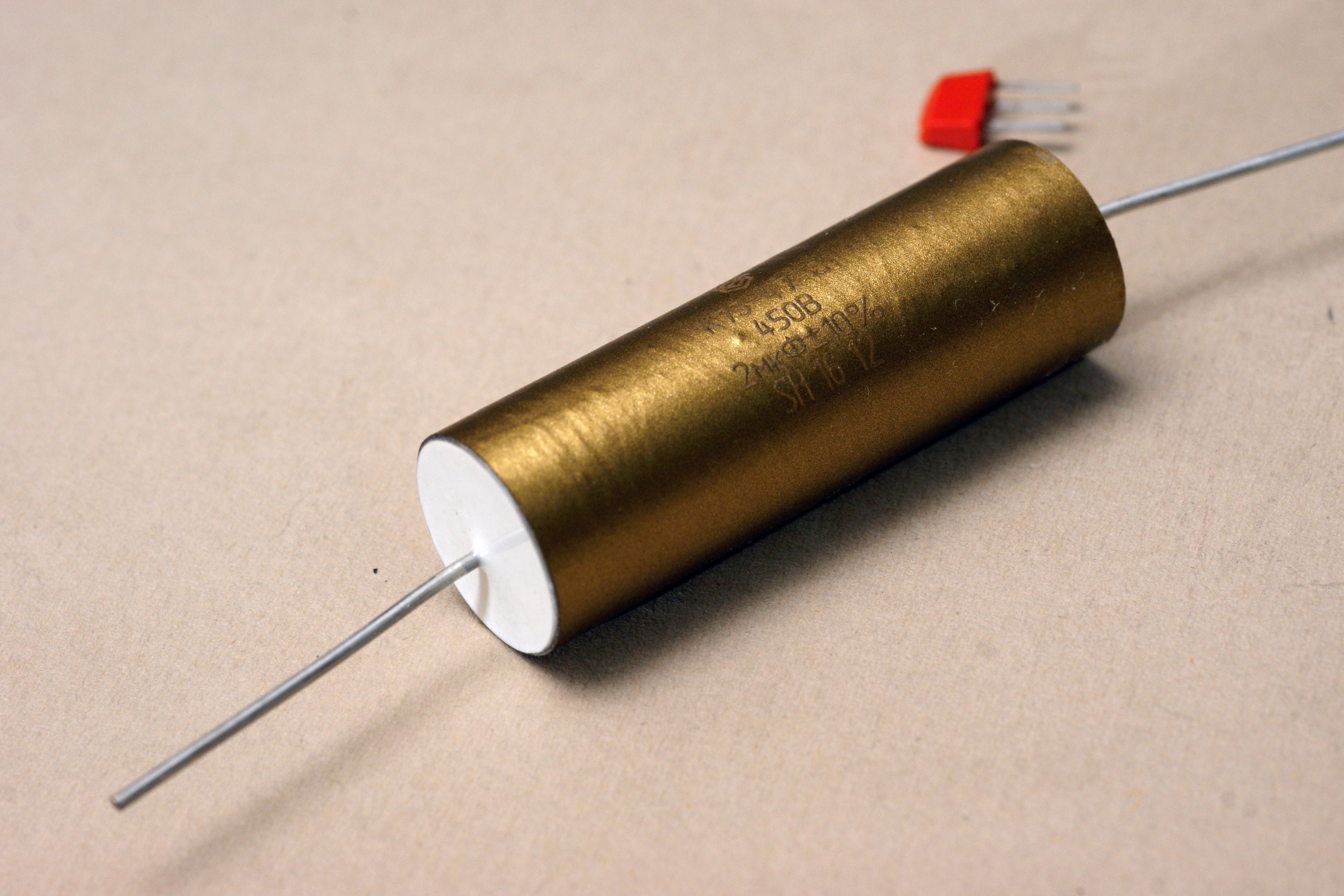 Металлопленочный конденсатор, на основе полиэтилентерефталатной пленки, предназначенный для работы "в качестве встроенных элементов внутри комплектных изделий в схемах однофазных асинхронных двигателей". Пусковой конденсатор, говоря простым языком. Покрашен очень красиво :))