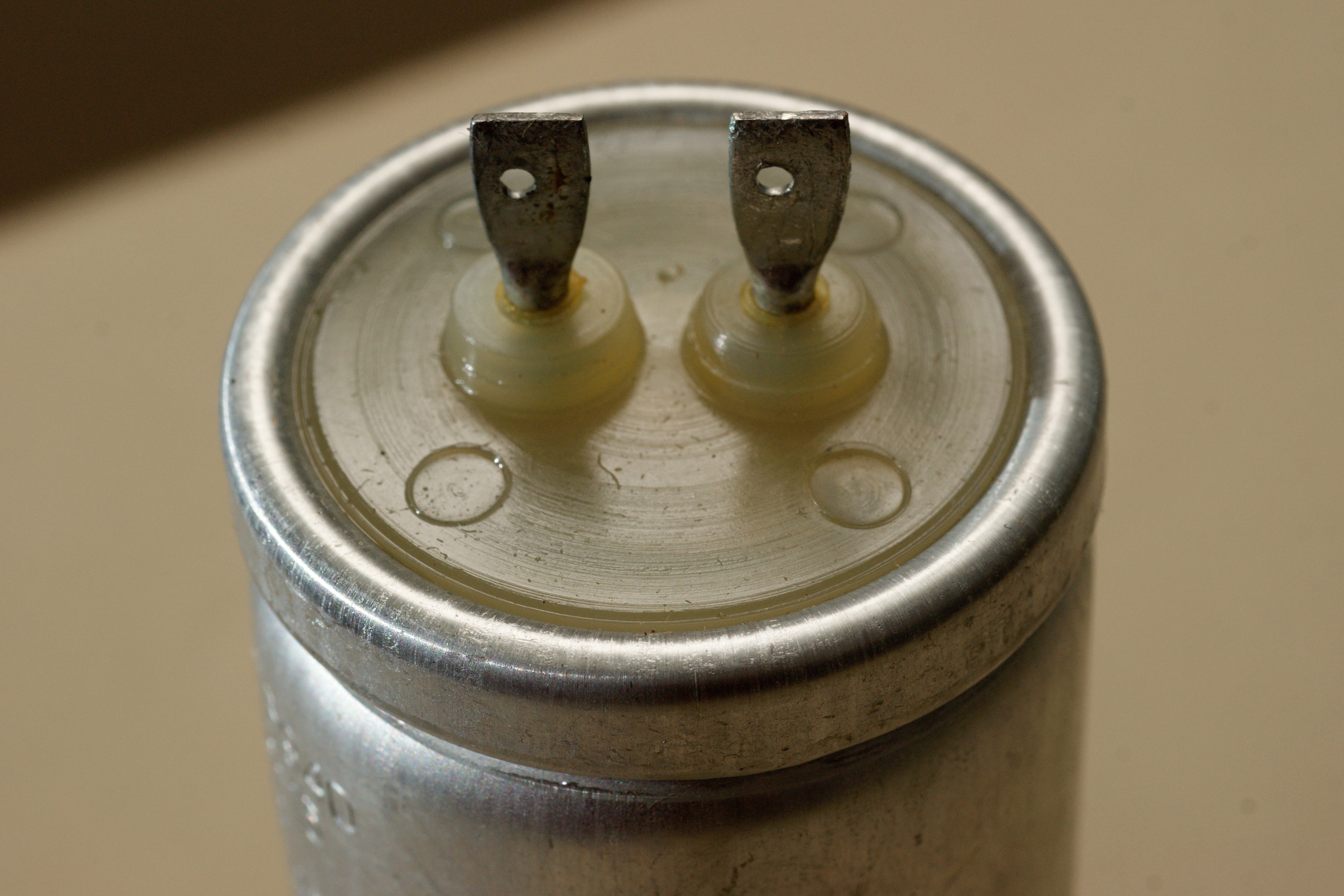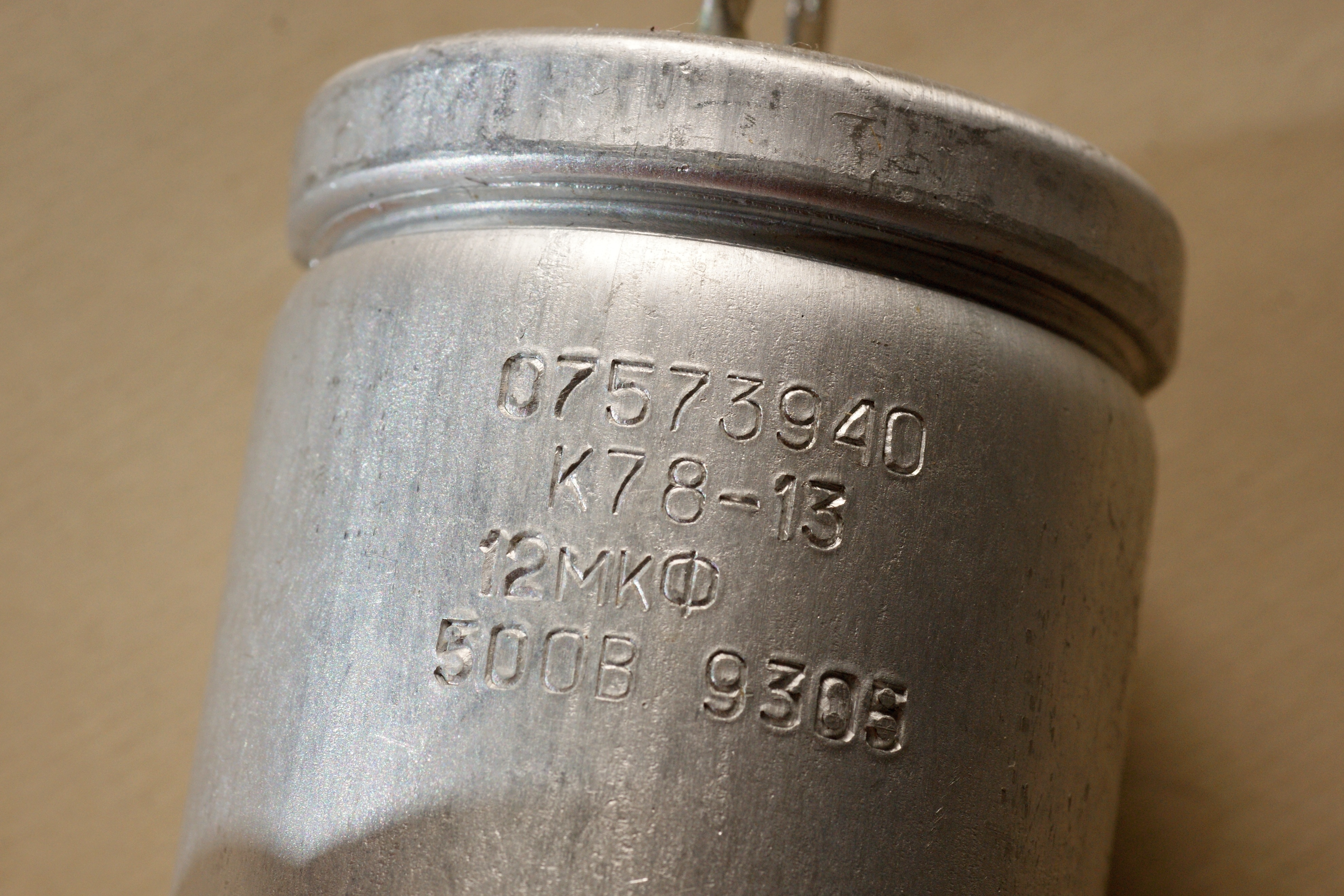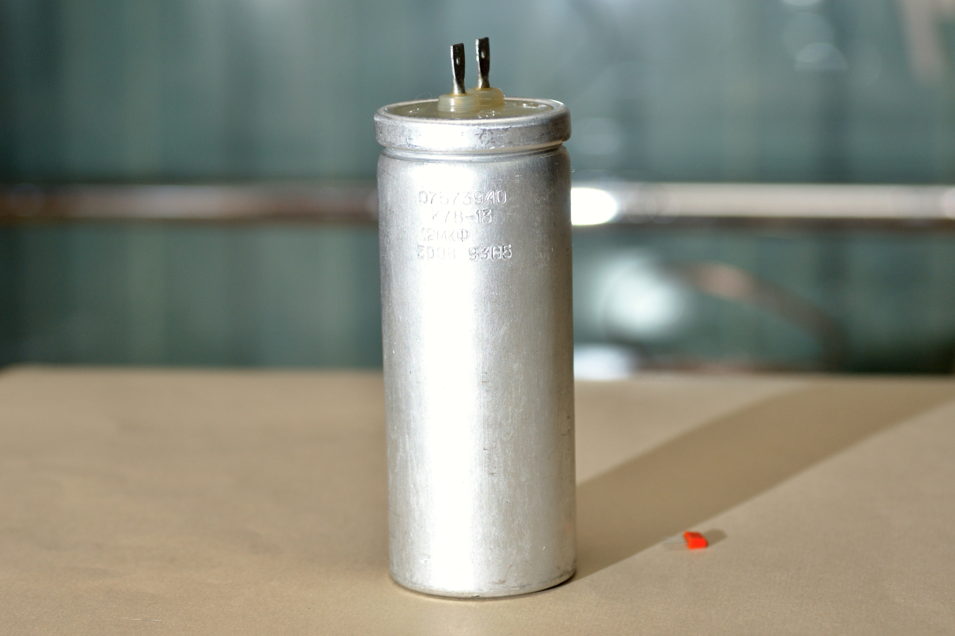 Полипропиленовый конденсатор из послесоветского времени. Скорее всего, пусковой, но никаких подробностей на него нет. Неизвестен даже производитель.