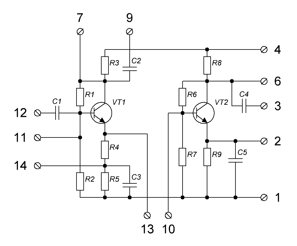 Судя по обозначению, микросхема должна относиться к эмиттерным повторителям. Однако схема более походит на смеситель трех сигналов с общей базой. Производитель - опять-таки Омский завод "Автоматика".