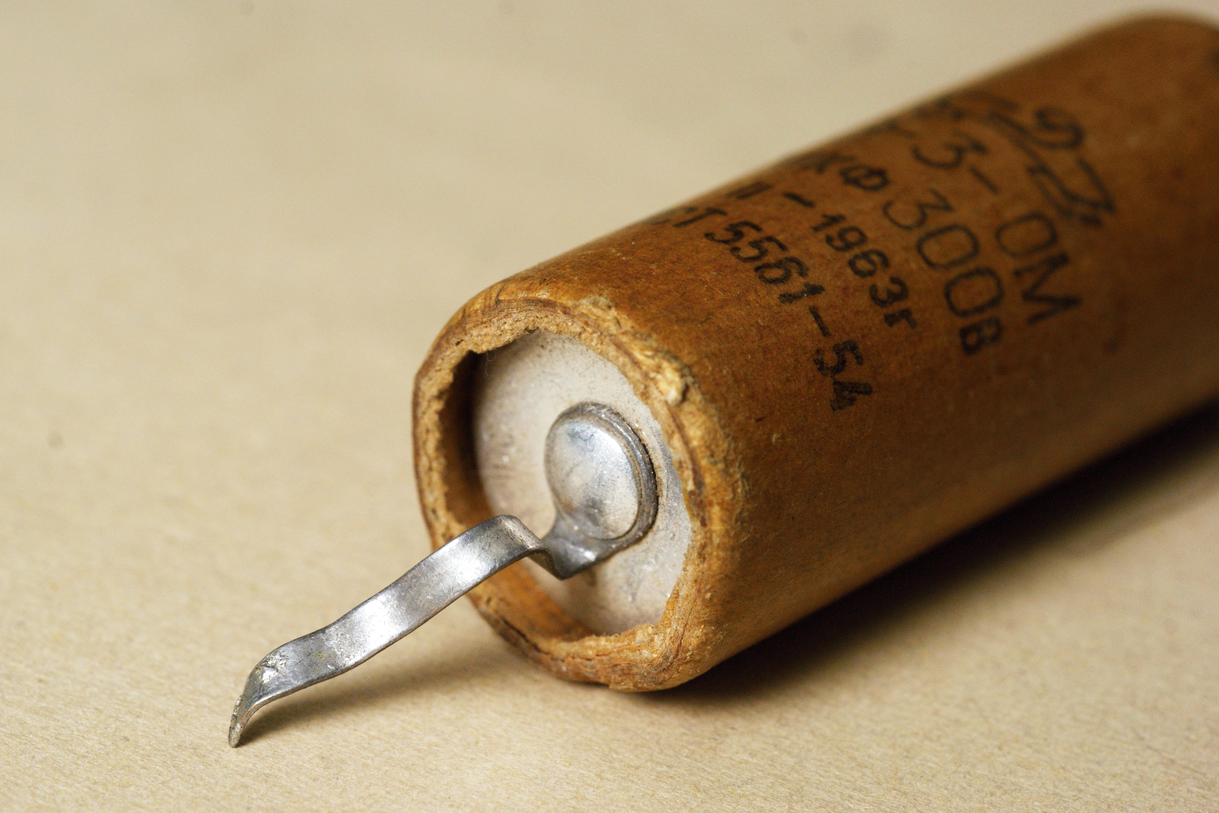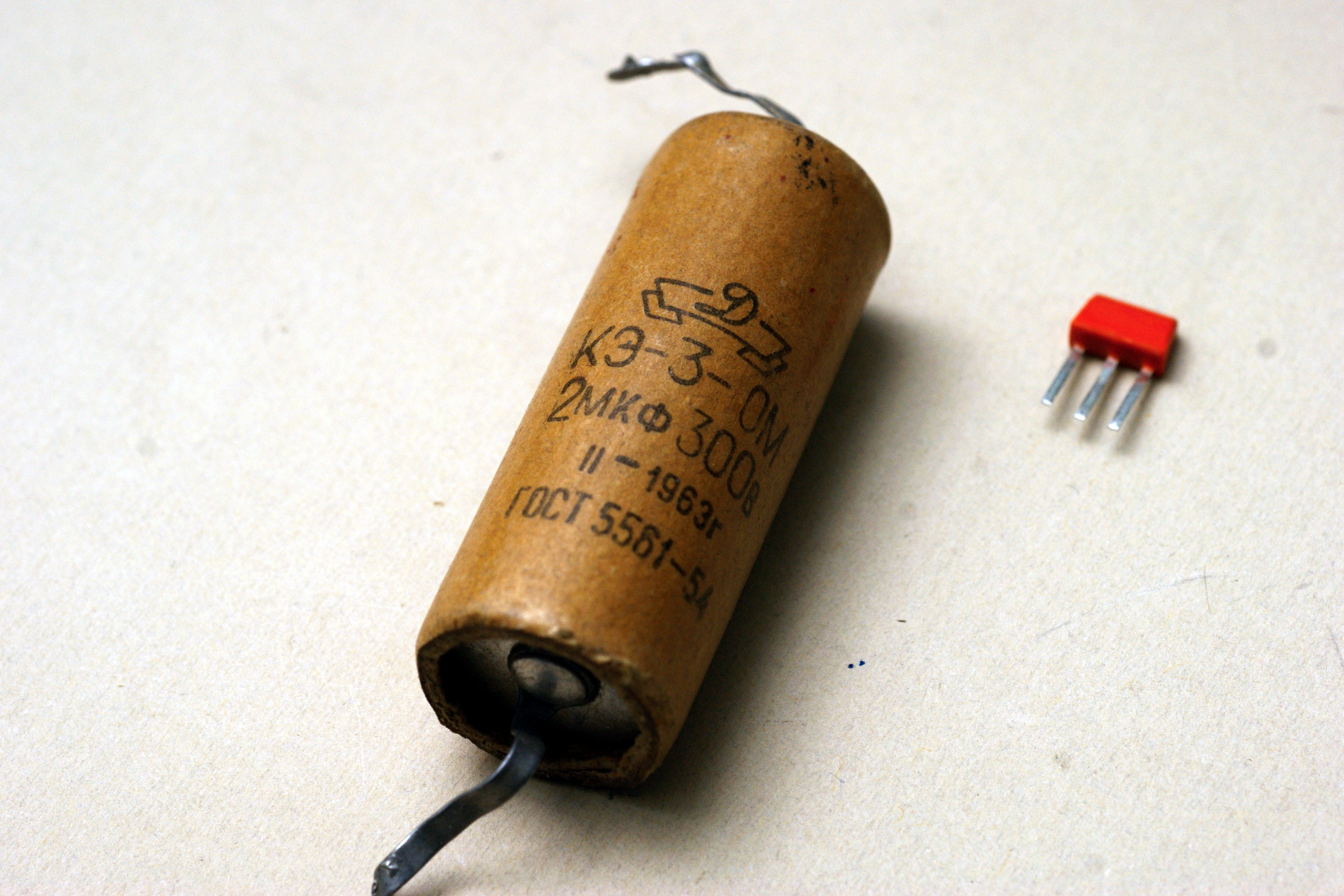 Третий вариант старых электролитических конденсаторов КЭ, по ГОСТ 5561-54 (до 1954 года - по ВТУ №623-48). "Тройка" - аксиальное исполнение, с гибкими выводами.