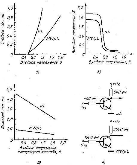 Входные, передаточные и выходные характеристики клапанов этих двух групп показаны на рисунке для нормальных внешних условий и разветвления на выходе, равного 1. На этом же рисунке показаны схемы клапанов и величины сопротивлений коллекторных и базовых резисторов схем быстродействующей микрологики и милливаттной микрологики.