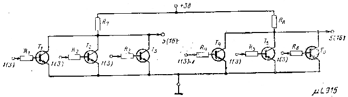 В результате этого выключаются транзисторы Т3 и Т6, входящие в состав входных клапанов на транзисторах Т1, Т2, Т3 и Т5, Т6, Т7. Кроме того, в схеме существует перекрестная связь с выходных транзисторов триггера Т11 и Т12 на базы транзисторов Т6 и Т2, благодаря которой один из этих транзисторов выключен, а другой включен. Этим блокируется один из клапанов НЕ-И.