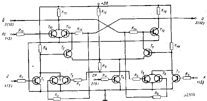 | uL916 | J-K триггер. Работает от отрицательных сигналов на входах J, K, CP или положительного сигнала на входе PS | Частота синхронизации до 10 МГц | 52 | |