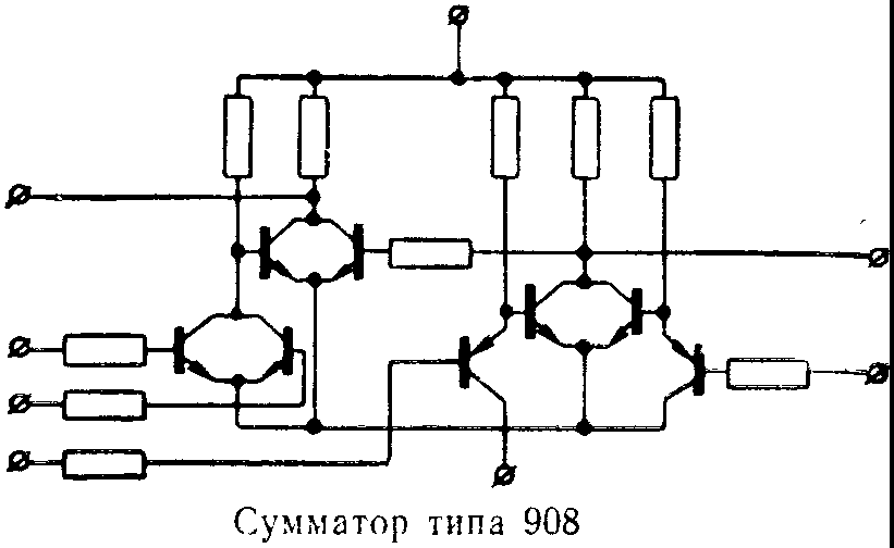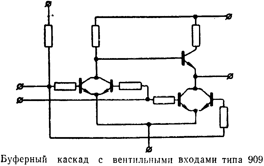 Вентиль типа 907 на четыре входа представляет собой схему НЕ—И/НЕ—ИЛИ с четырьмя входами. Время распространения сигнала 12 нсек, рассеиваемая мощность 12