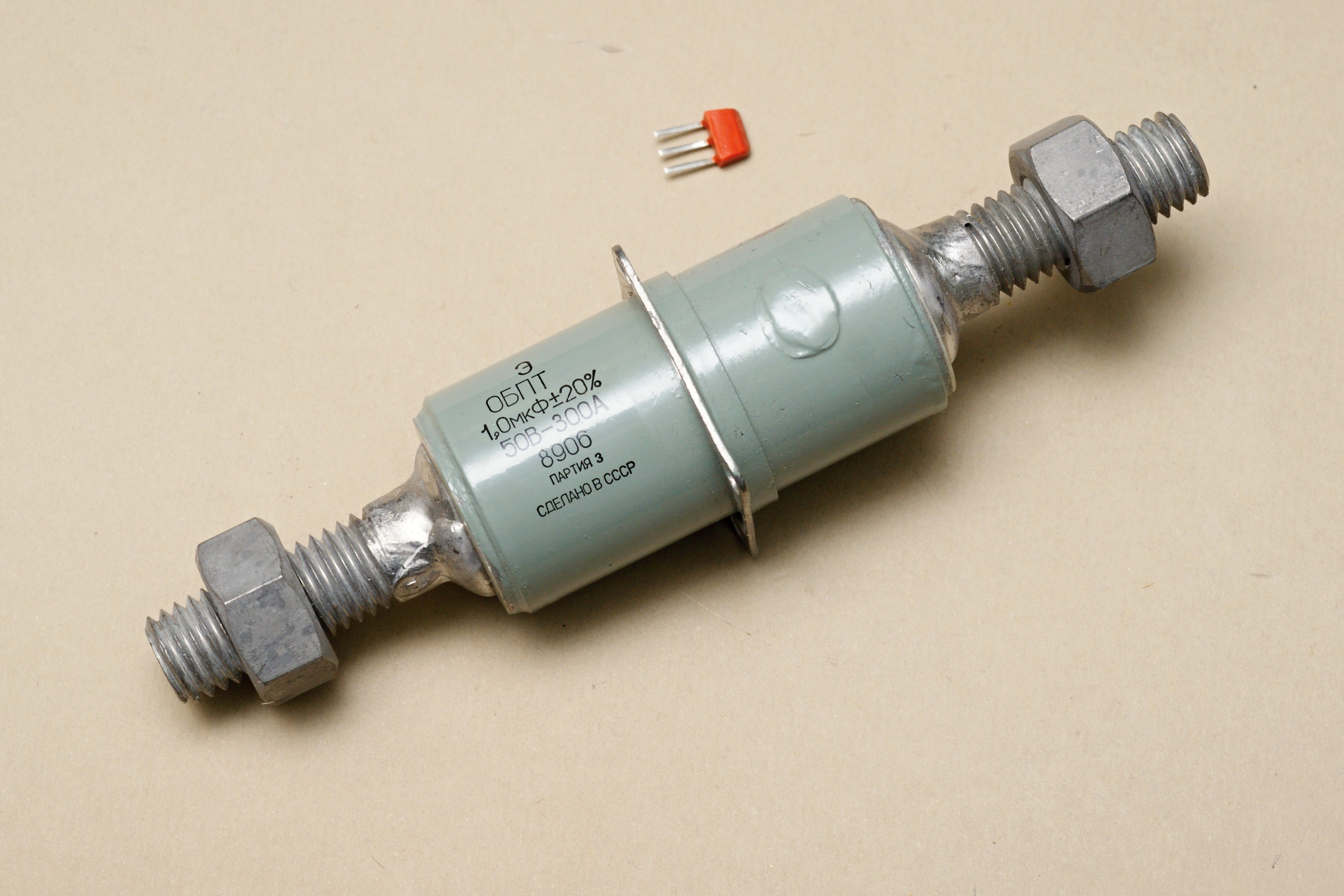 Если бы конденсатор с фото был лет на тридцать моложе, то в документации он назывался бы "ОБПТ-50-300-1 УП0.462.018ТУ специальный". Такую добавку "специальный" я, пожалуй, более ни у каких конденсаторов не встречал. Видимо, ОБПТ имел на то основания.