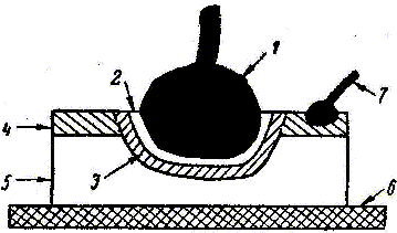 1 — капля сплава, 2 — эмиттерный рекристаллизационный слой, 3 — базовый диффузионный слой (n-типа), 4 — базовый слой n-типа исходной пластинки, 5 — коллекторный слой p-типа исходной пластинки, 6 — кристаллодержатель, 7 — вывод базы. |