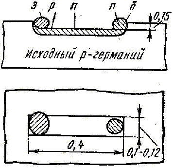 В пластинке исходного р-германия с удельным сопротивлением 0,8-1 ом*см делаются углубления (лунки).
