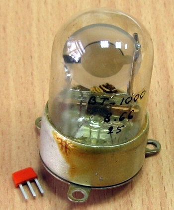 Кварцевый резонатор ТЦ3.293.141ТУ на 1000 кГц, с не вполне понятным обозначением - почему ВТ? Существует и другой ВТ-1000, в металлической колбе. Так что, возможно, название относится не к самим резонаторам, а к их области применения. |