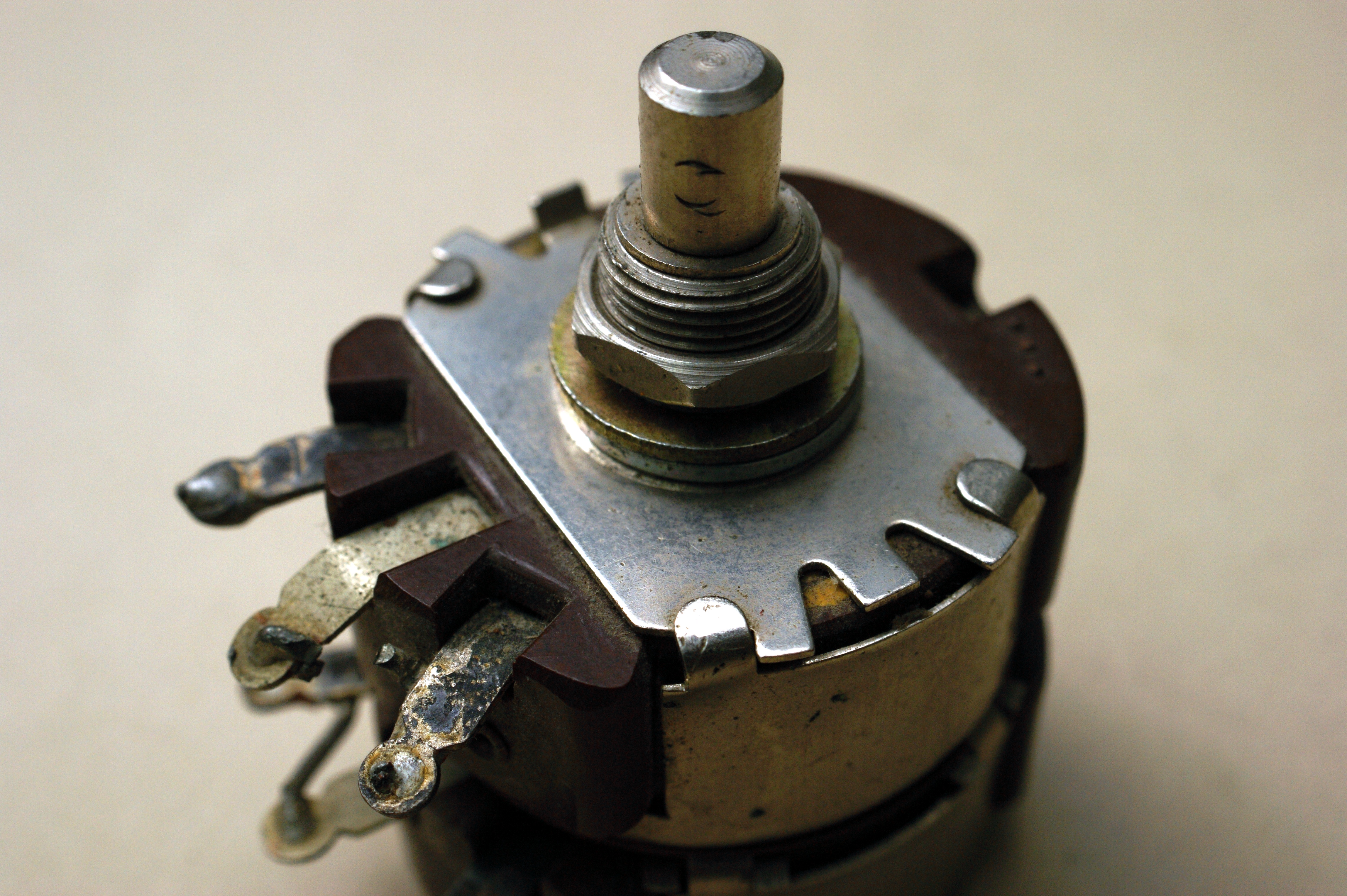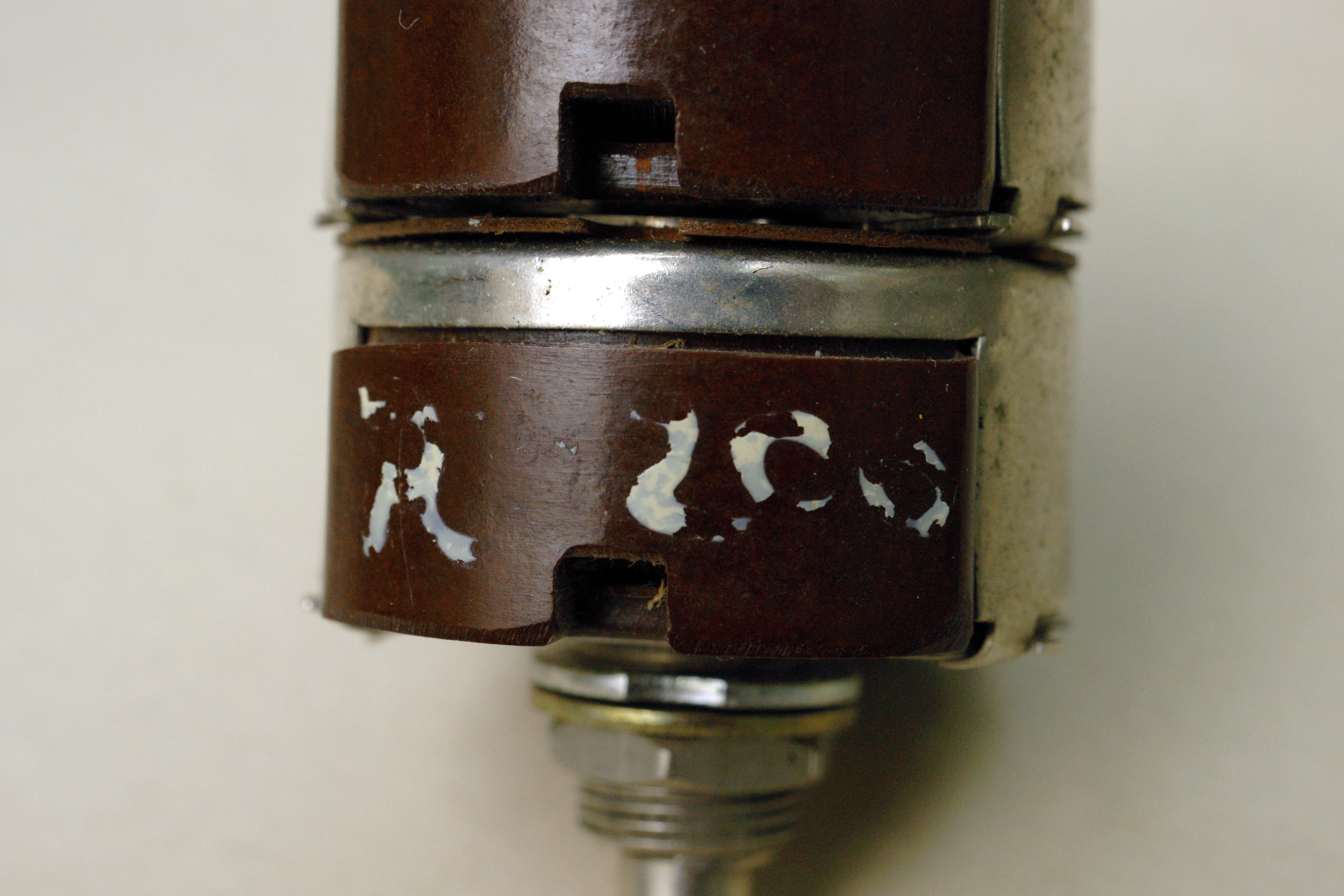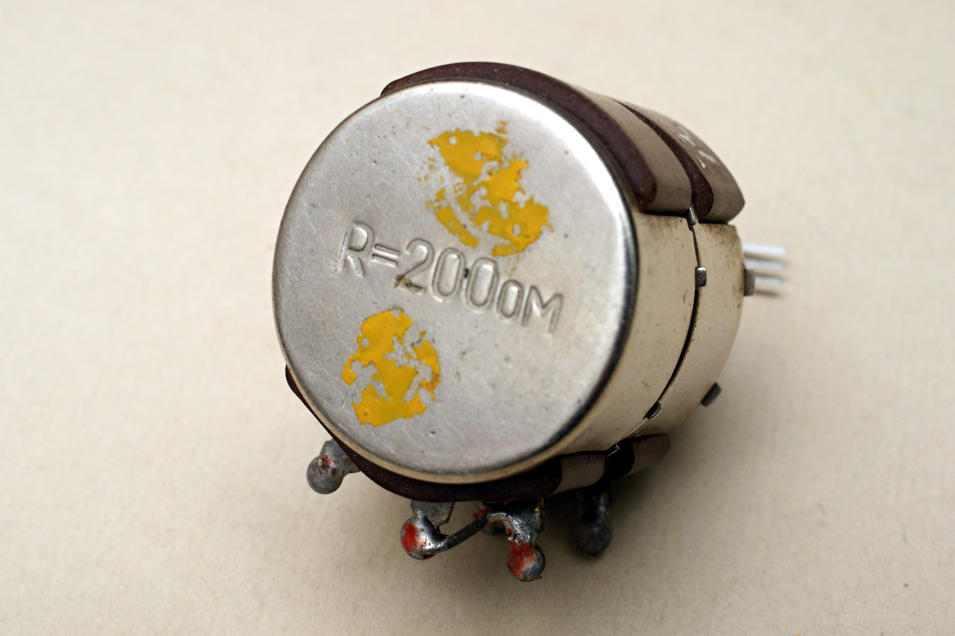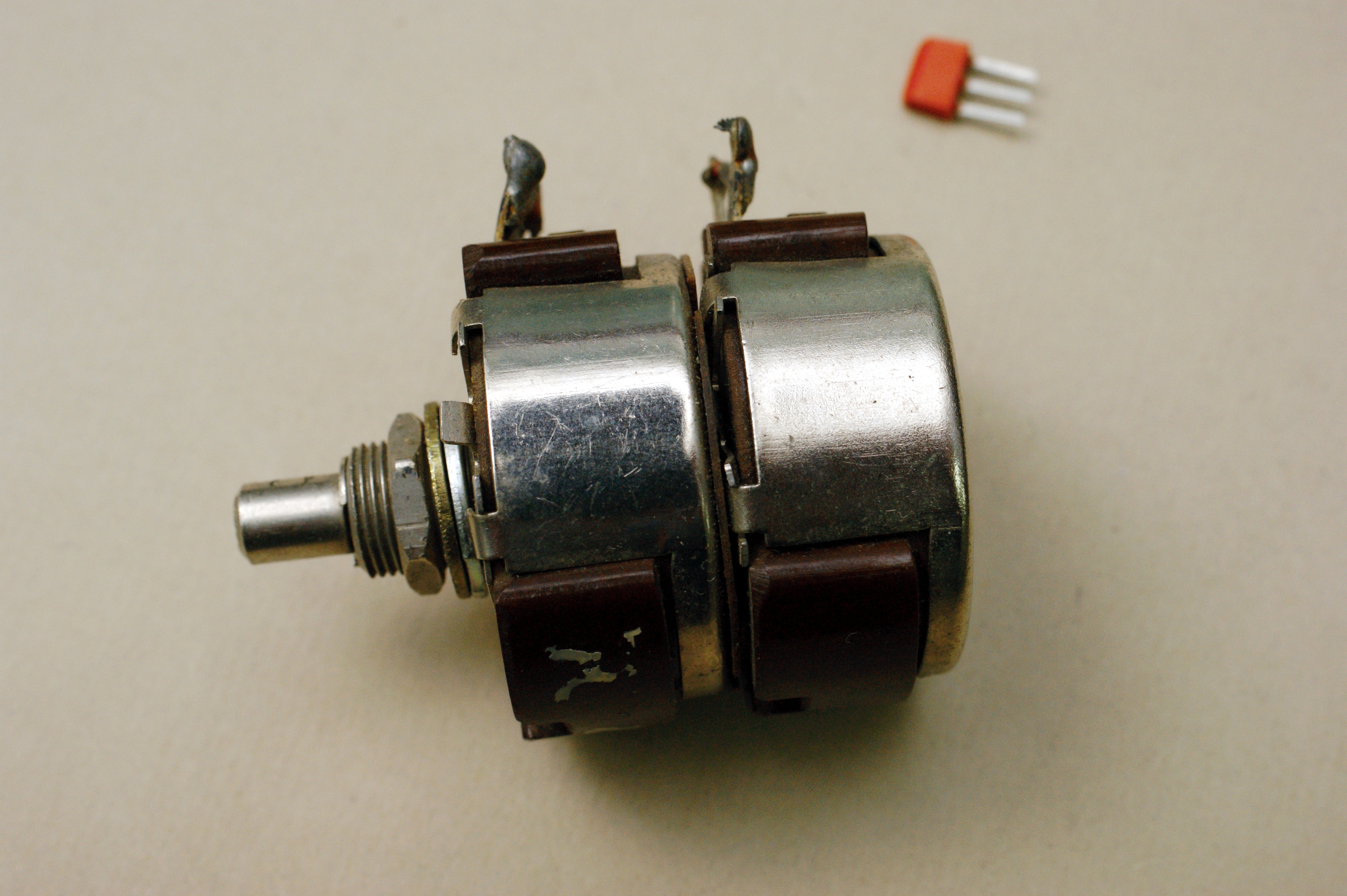 Сдвоенный переменный резистор на 200 Ом. Подобные у меня уже есть, к примеру РП-3, но всё же конструкция у него отличается. Есть карболитовый прилив со стороны, противоположной выводам, и крепление металлических частей выполнено по-другому. Так что я считаю его отдельным типом.