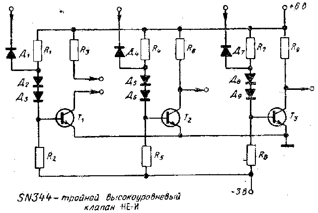 Две цифровые интегральные схемы (SN345 и SN348) обеспечивают подключение магнитных головок записи запоминающего устройства на магнитном диске, используемого в цифровой вычислительной машине D37B, и выполнение записи информации в это запоминающее устройство. Схема SN348 является тройной двухвходовой схемой НЕ-ИЛИ, используемой в качестве матричного переключателя, переключающего ток 6 ма в нагрузку, имеющую сопротивление 2 ком. Время включения и выключения составляет 0,4 мксек.