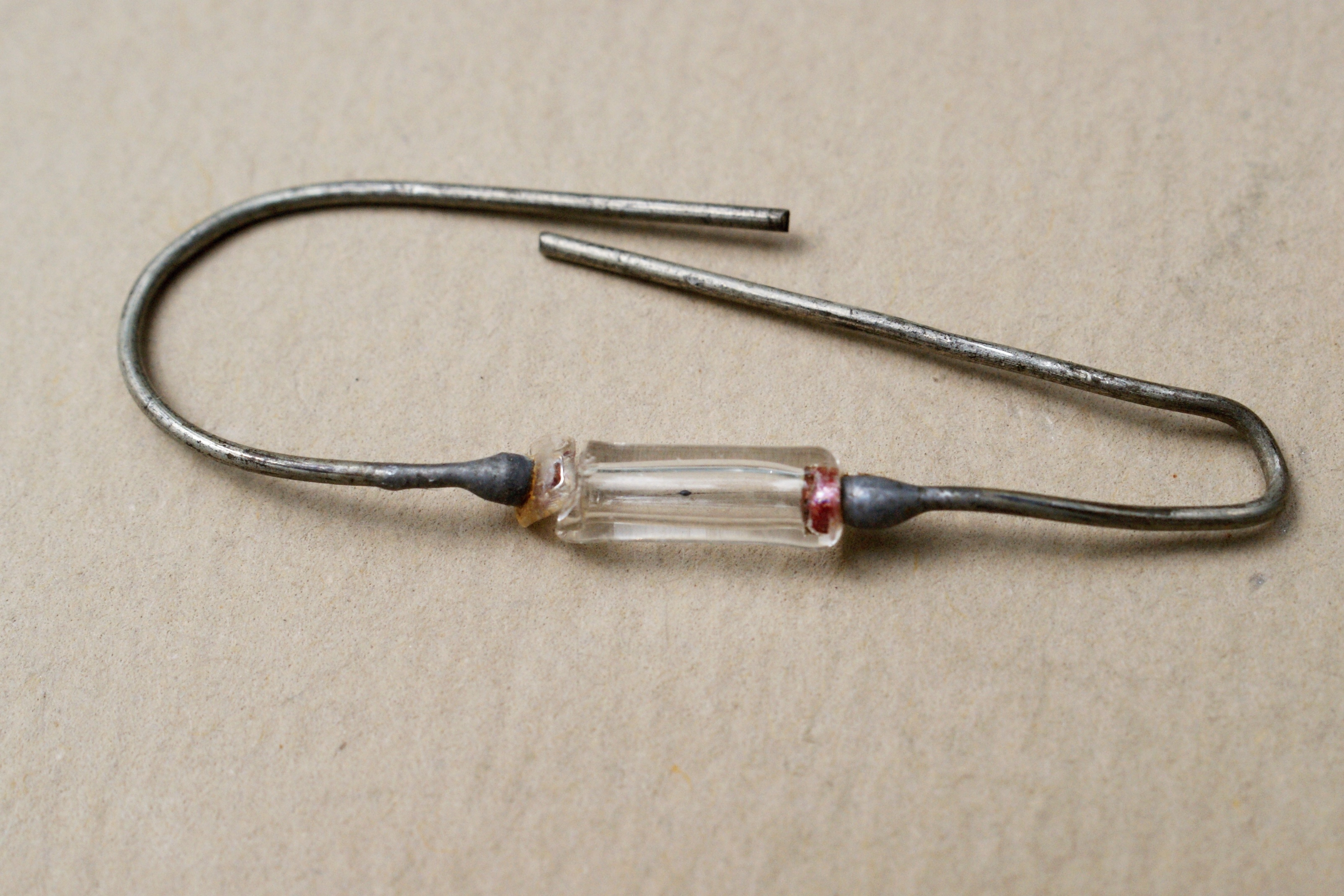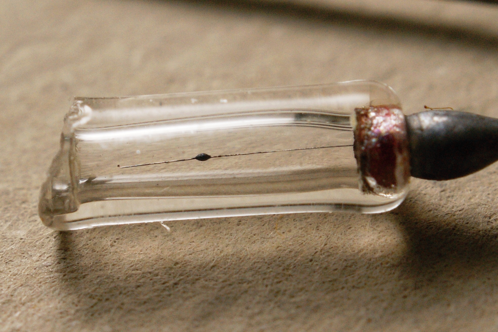 "К маленькому шарику из полупроводникового материала прикреплены тонкие вольфрамовые выводы. Шарик с выводами помещается в стеклянный баллон диаметром приблизительно 3 мм и длиной 7-9 мм." [1]