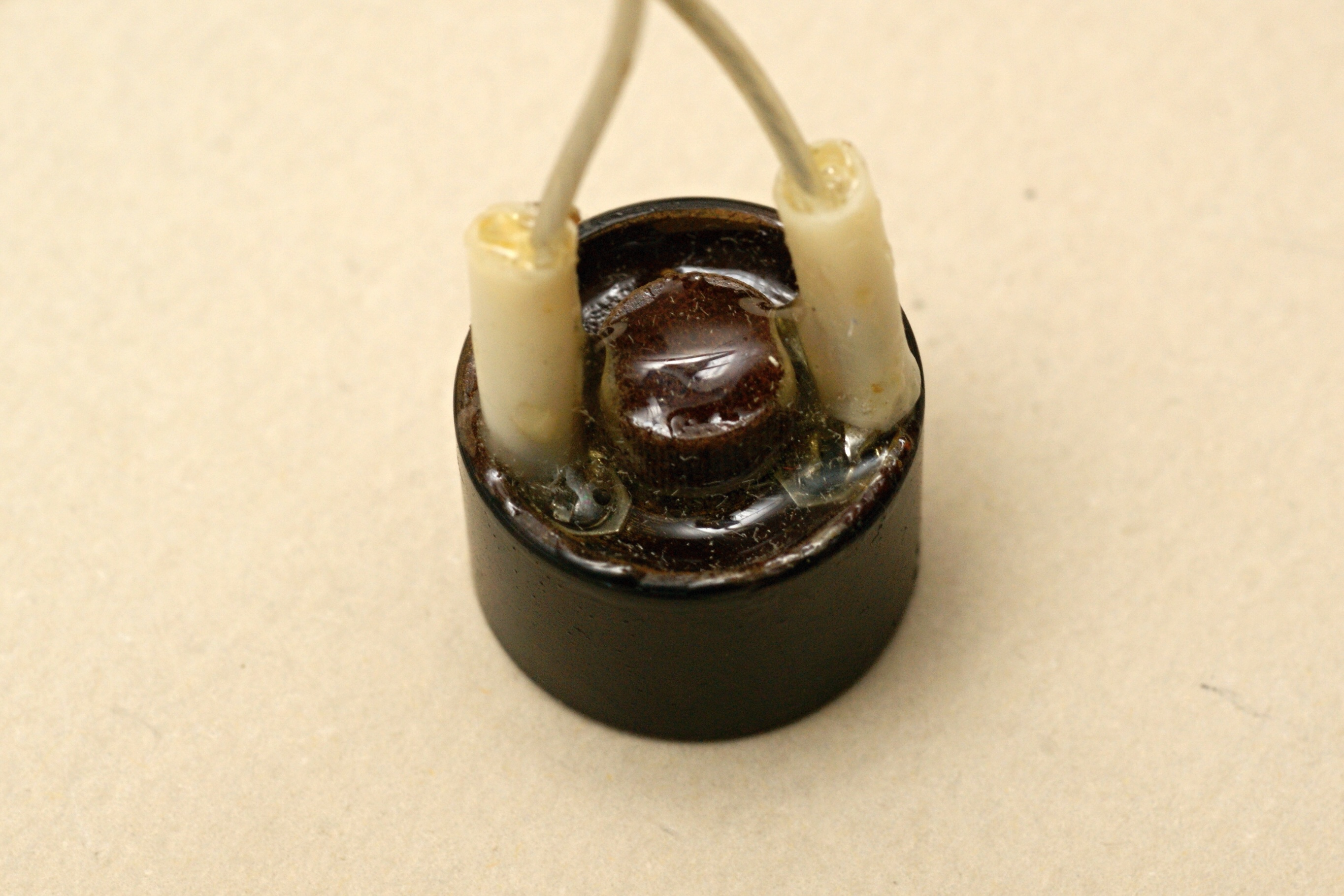 Неизвестен и материал чувствительного элемента, только его размер - 2,2х1,5 мм. Спектральный диапазон зависит от материала входного окна; мой образец, судя по виду, имел фильтр из иодида цезия и, значит, предназначен для работы с тепловым излучением 0,3...45 мкм. При этом входное окно явно потеряло рабочее состояние из-за поглощения влаги. Эти приборы весьма капризны к внешним условиям, храниться и работать они могли только при температурах не ниже +15 и не выше +25°С, и при невысокой влажности.