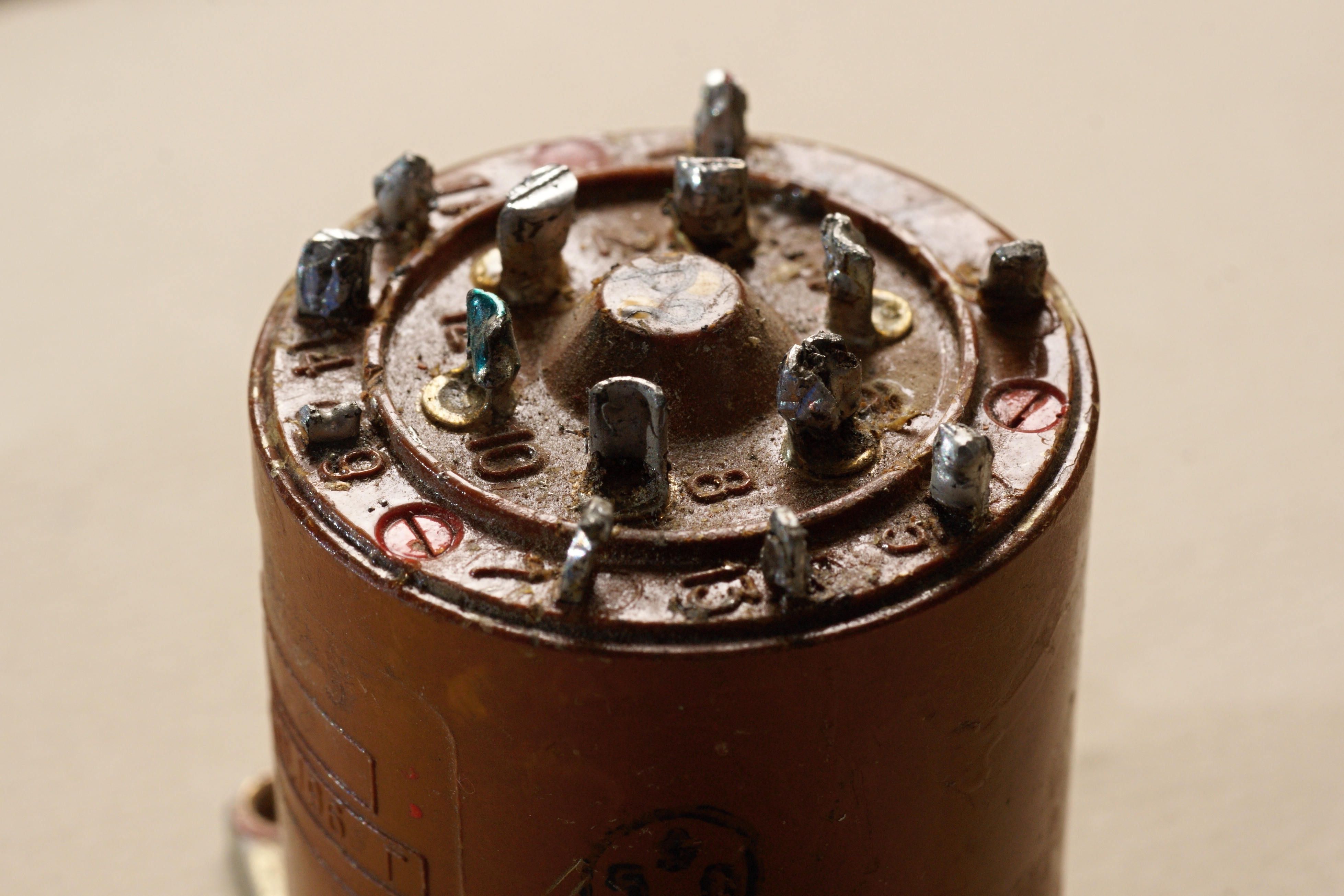 На первый взгляд, название реле на корпусе не указано. Но это лишь на первый. На самом деле название, личный номер и дата выпуска выцарапаны в пластмассе.