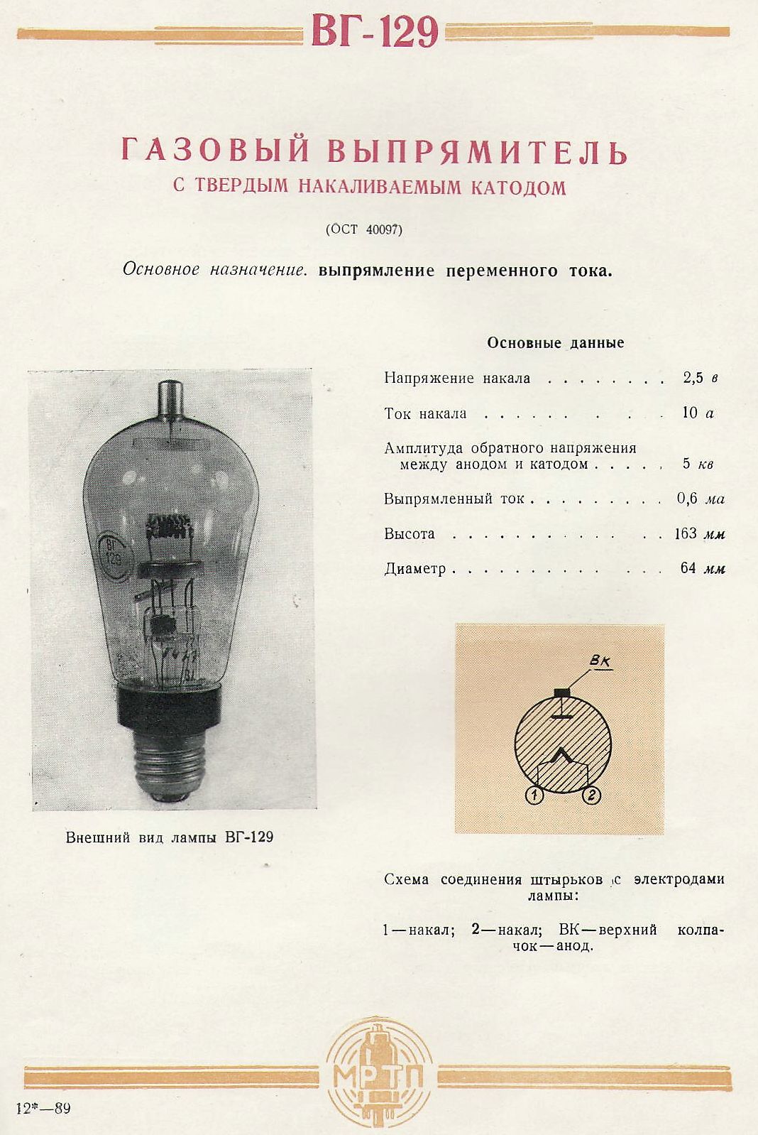 Одноанодный газотрон с оксидным катодом прямого накала, заполнение - пары ртути. Катод выполнен в виде спирали из ленты, навитой на ребро; такая конструкция повышает механическую прочность и улучшает тепловую экранировку витка. Анод изготовлен из железа. Газотрон требует раздельного включения напряжения накала и анодного напряжения. Этот газотрон выпускался также под названием ВГ9. До войны его производством занималась питерская "Светлана", а в 1942 году он был передан на Завод электронной техники им. Ленина (ныне "Фотон", г.Ташкент, Узбекистан). Справочный листок, паспорт, информационный листок из каталога за 1954 год и данные из отраслевого справочника на него. Необычный для ионных приборов цоколь - резьбовой (Р-27 по ГОСТ 2520-51), в точности как у самой обычной электролампочки еще со времен Эдисона... |