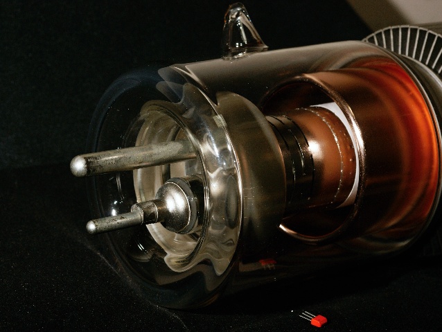 Очень редкий кенотрон, который безусловно можно отнести к топам электровакуумных приборов. Он предназначен для работы в качестве клиппирующего или выпрямительного диода; анодный ток в импульсе до 50 ампер, средний 1 ампер; максимальное напряжение в клиппирующем режиме 50 киловольт, в выпрямительном - 35 киловольт; допустимая мощность на аноде до 1,2 киловатта; лампа требует принудительного воздушного охлаждения.